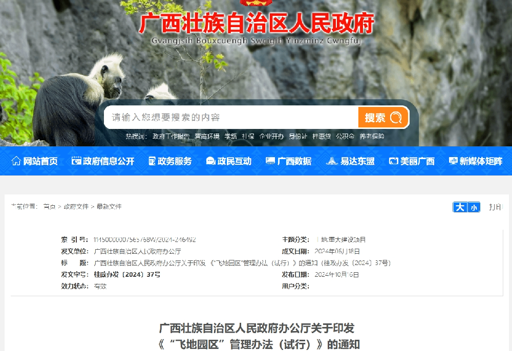 10月16日,广西壮族自治区人民政府办公厅发布关于印发《“飞地园区”管理办法(试行)》(以下简称《办法》)的通知。