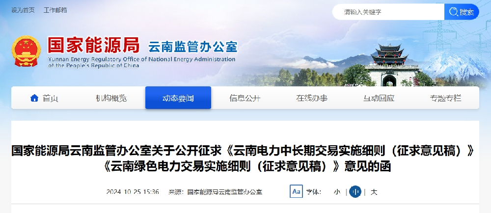 近日,国家能源局云南监管办公室发布了关于公开征求《云南电力中长期交易实施细则(征求意见稿)》《云南绿色电力交易实施细则(征求意见稿)》意见的函。