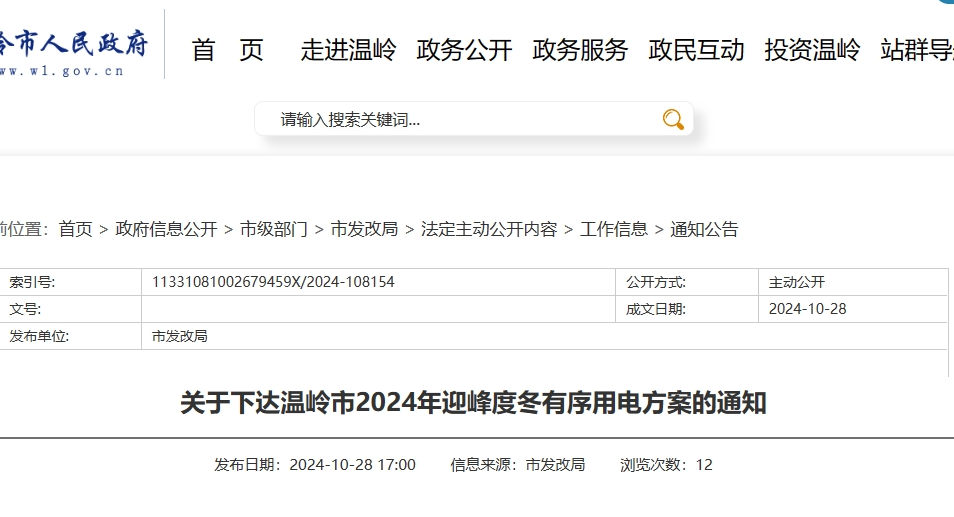 10月28日,浙江温岭市人民政府下达温岭市2024年迎峰度冬有序用电方案的通知。