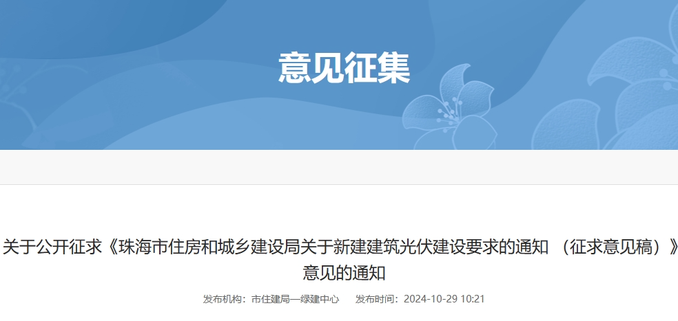 关于公开征求《珠海市住房和城乡建设局关于新建建筑光伏建设要求的通知 (征求意见稿)》意见的通知