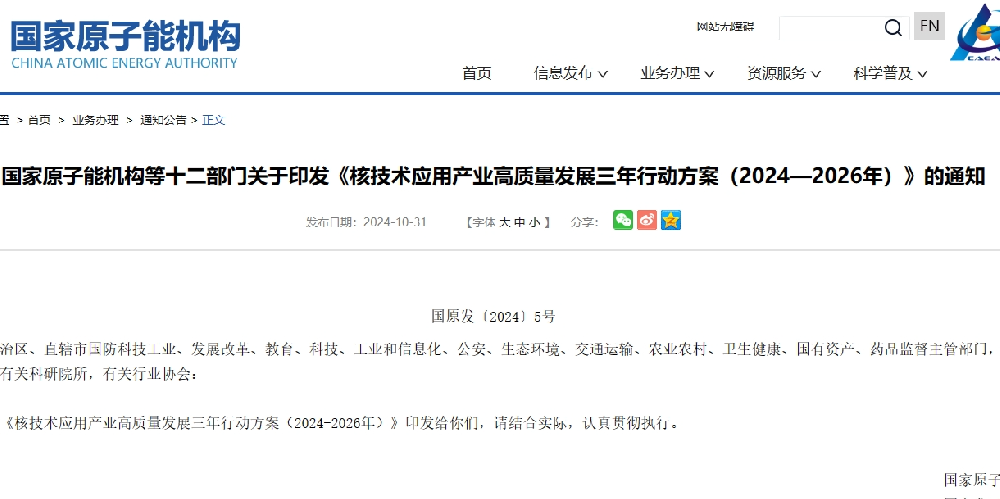 国家原子能机构等十二部门关于印发《核技术应用产业高质量发展三年行动方案(2024—2026年)》的通知