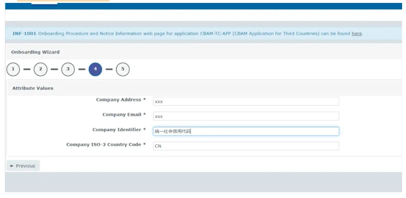 在网页第4步,填写公司的信用代码(特别注意,这里的信用代码前面要加上入公司所在国家的两个字母代码,例如:CN93L12345678,这一步没有填对最后一步无弹出提交按钮!!!),如果是中国国内公司最后一栏选择“CN”