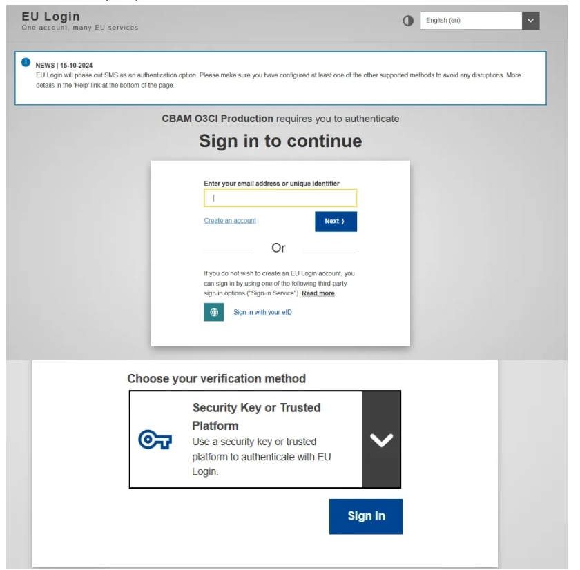 为了在欧盟登录中进行身份验证,需要进行双因素认证,因此需要适当设置。根据国家的不同,身份验证方法的可用性可能有所不同。 为了CBAM系统账号注册,推荐以下验证方法中的任何一种:
