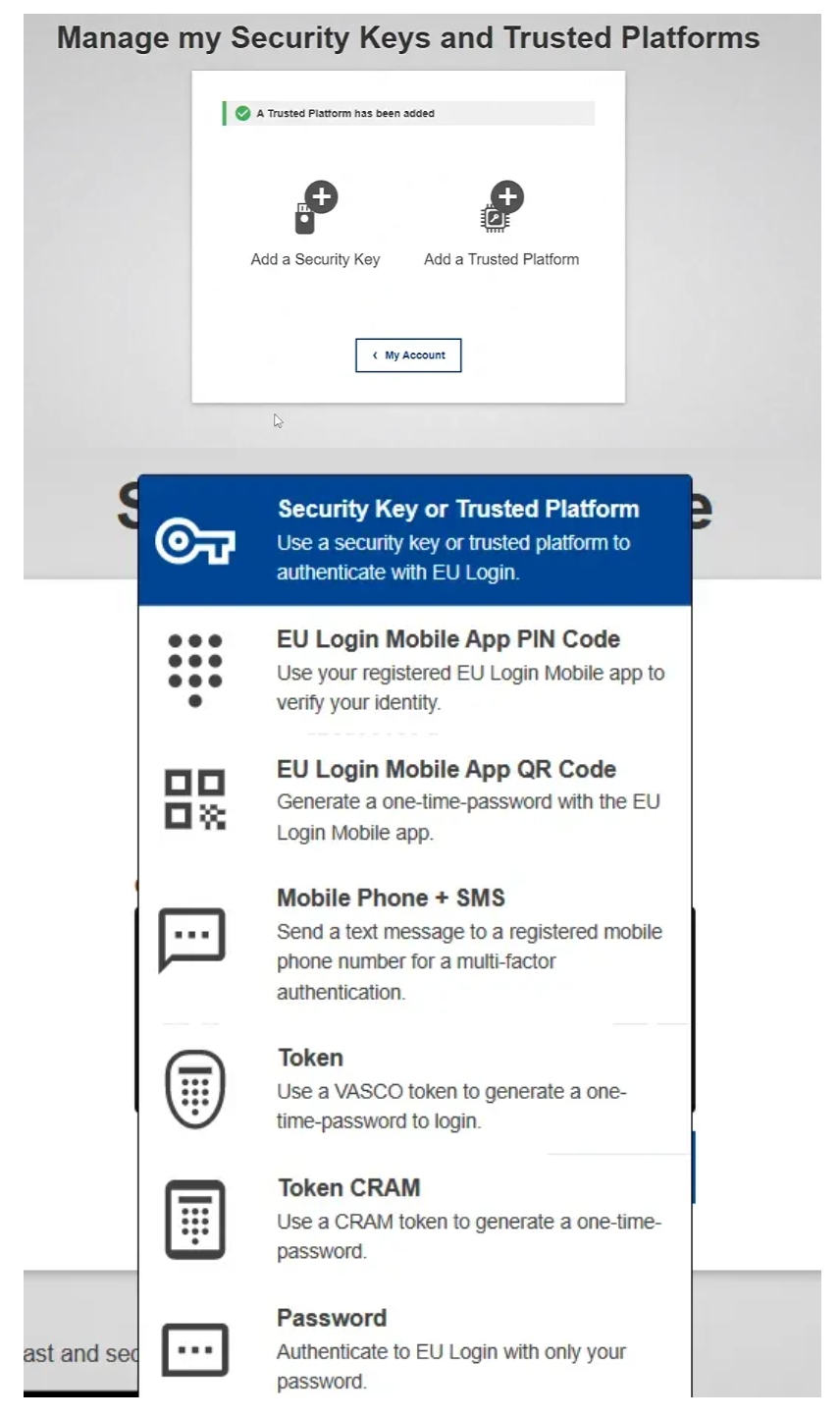 ②在网页上 https://webgate.ec.europa.eu/cas/login 登录你的EU账号,打开My Account,选择“manage my security keys and trusted platforms",之后选择”Add a trusted Platflorm"