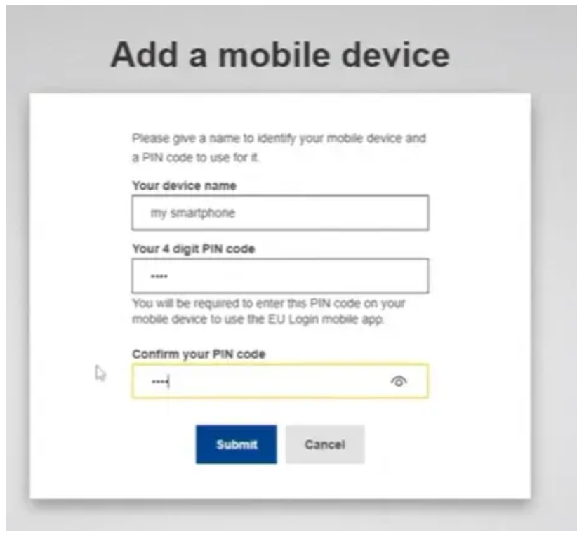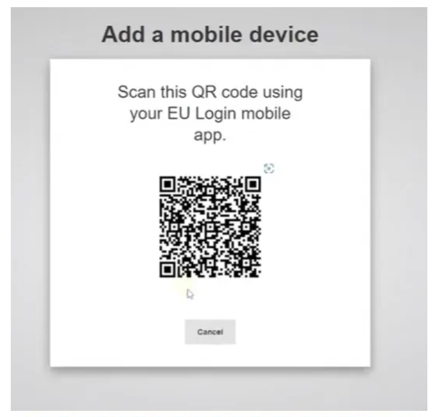 ④将根据您的输入生成一个 QR 码。您需要使用 EU Login Mobile 应用程序扫描此二维码以完成注册