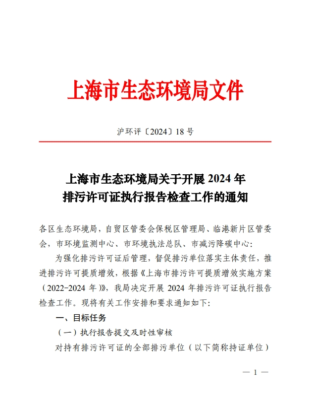 上海市生态环境局关于开展 2024 年 排污许可证执行报告检查工作的通知.pdf