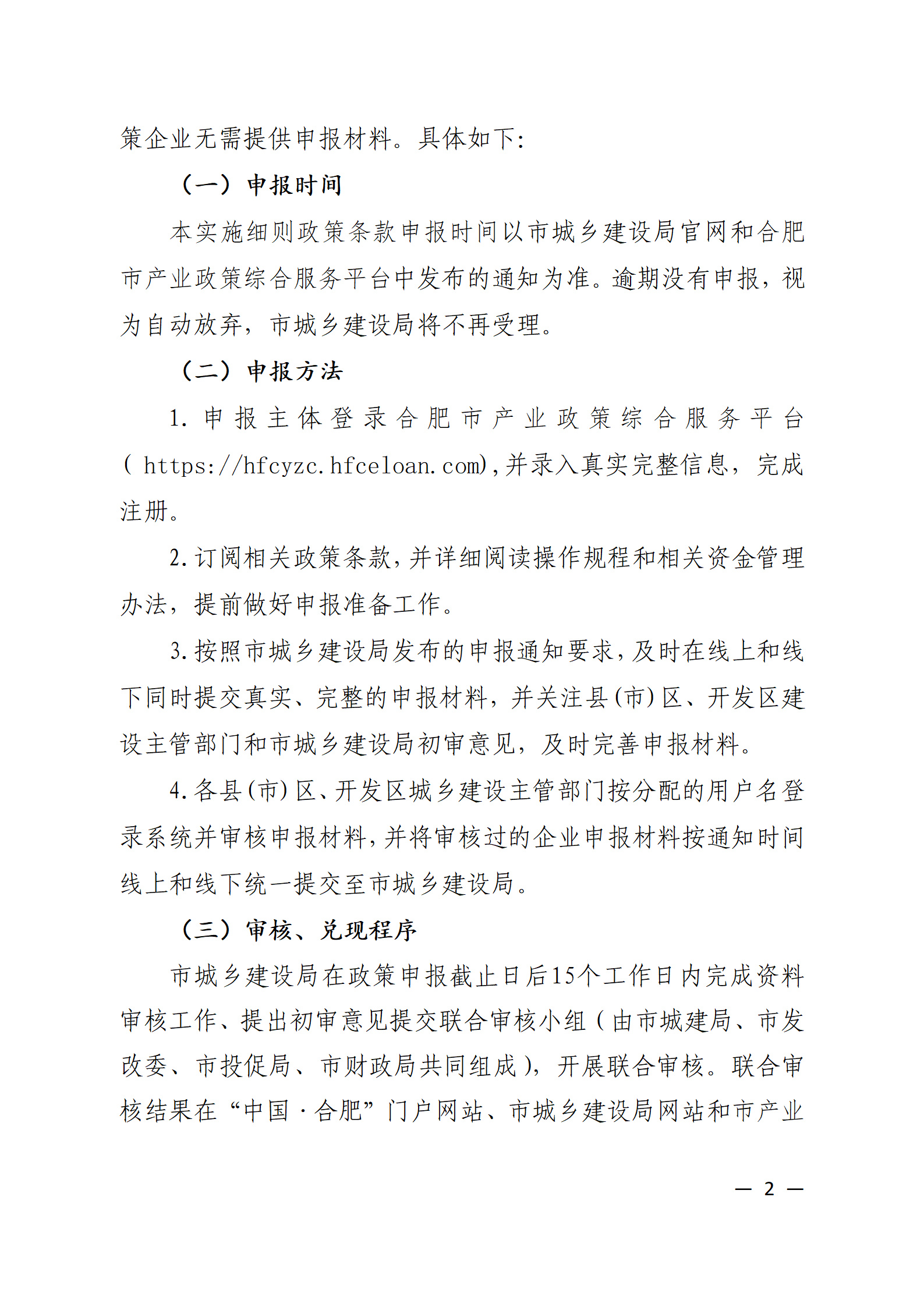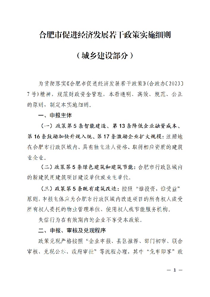 详见《关于印发〈合肥市促进经济发展若干政策实施细则(城乡建设部分)〉的通知》(合建〔2023〕50号,附件1),申报材料纸质版请附封面(附件2)胶装。