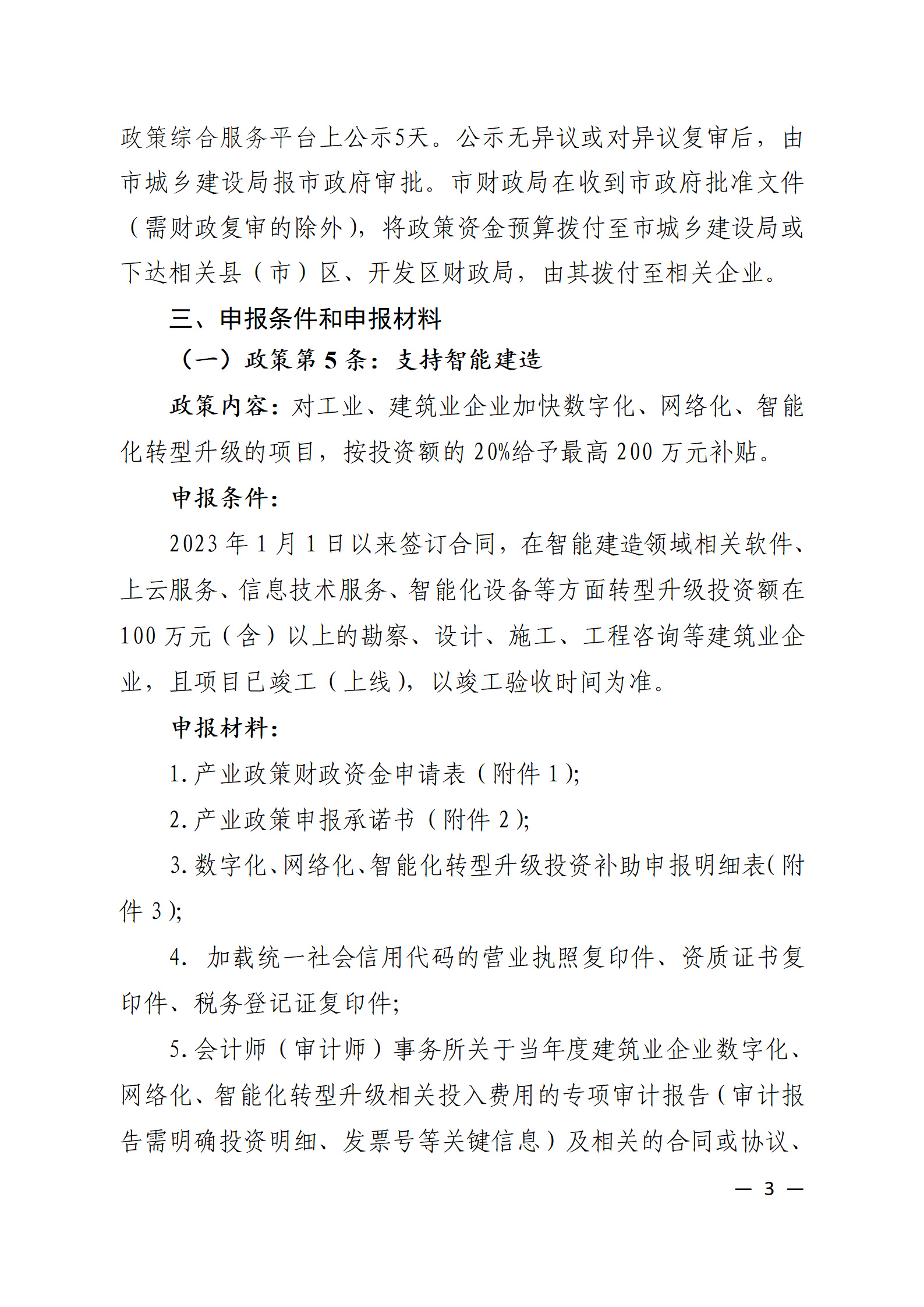 1.支持智能建造:对2023年1月1日至2023年12月31日期间,建筑业企业加快数字化、网络化、智能化转型升级项目,按投资额20%给予最高200万元补贴。