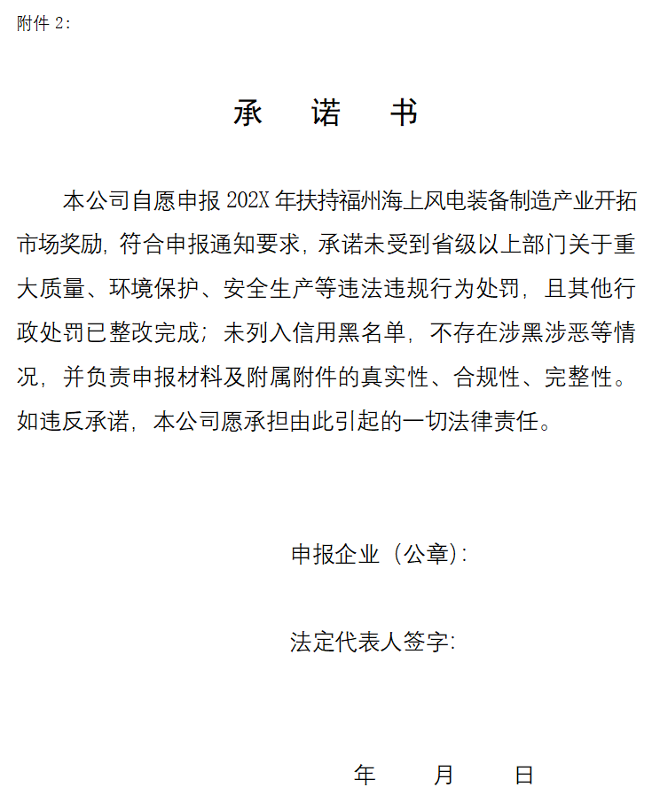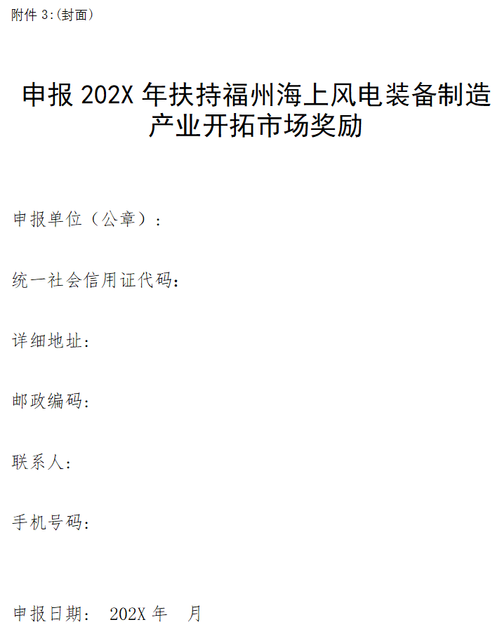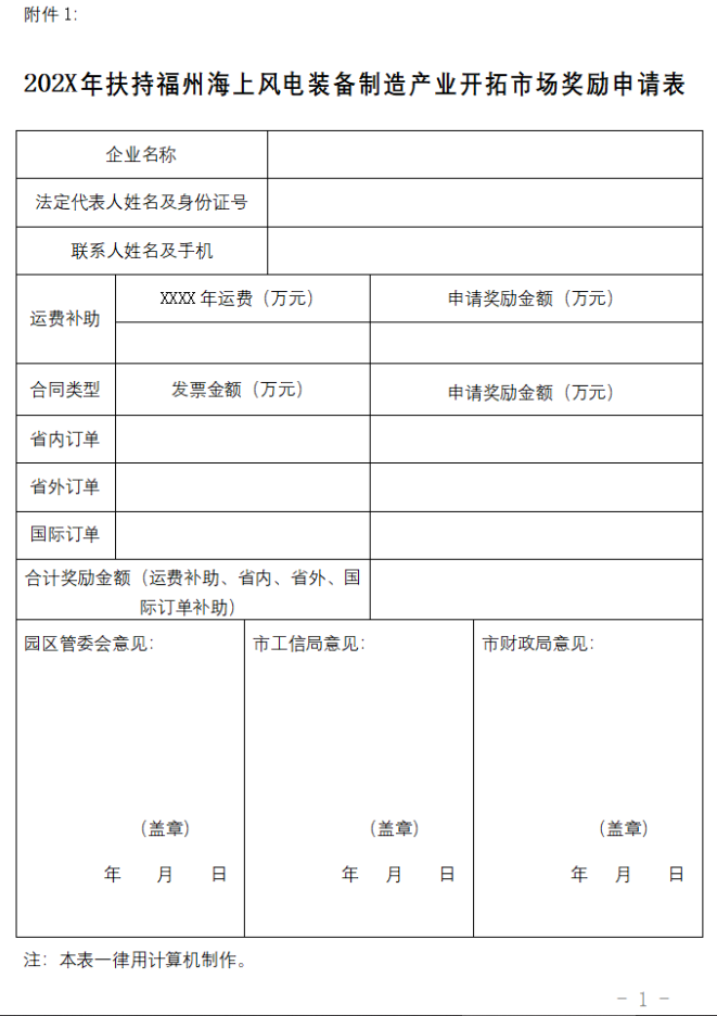 1、202X年扶持福州海上风电装备制造产业开拓市场奖励申请表;