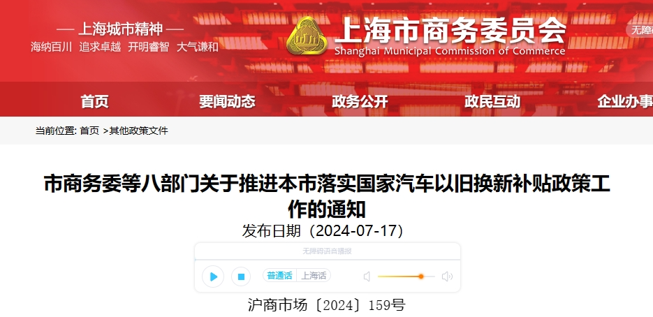 7月17日,上海市商务委等八部门印发《关于推进本市落实国家汽车以旧换新补贴政策工作的通知》,其中明确了补贴标准中乘用车的范围、以及补贴对象和要求。
