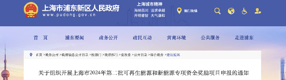 上海市浦东新区发展和改革委员会发布《关于组织开展上海市2024年第二批可再生能源和新能源专项资金奖励项目申报的通知》。