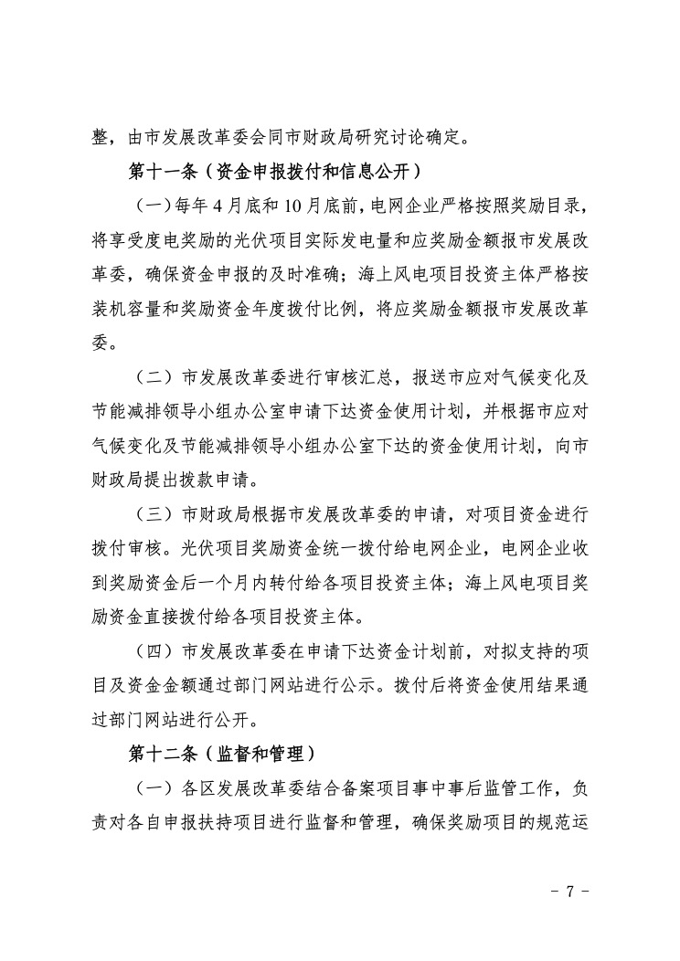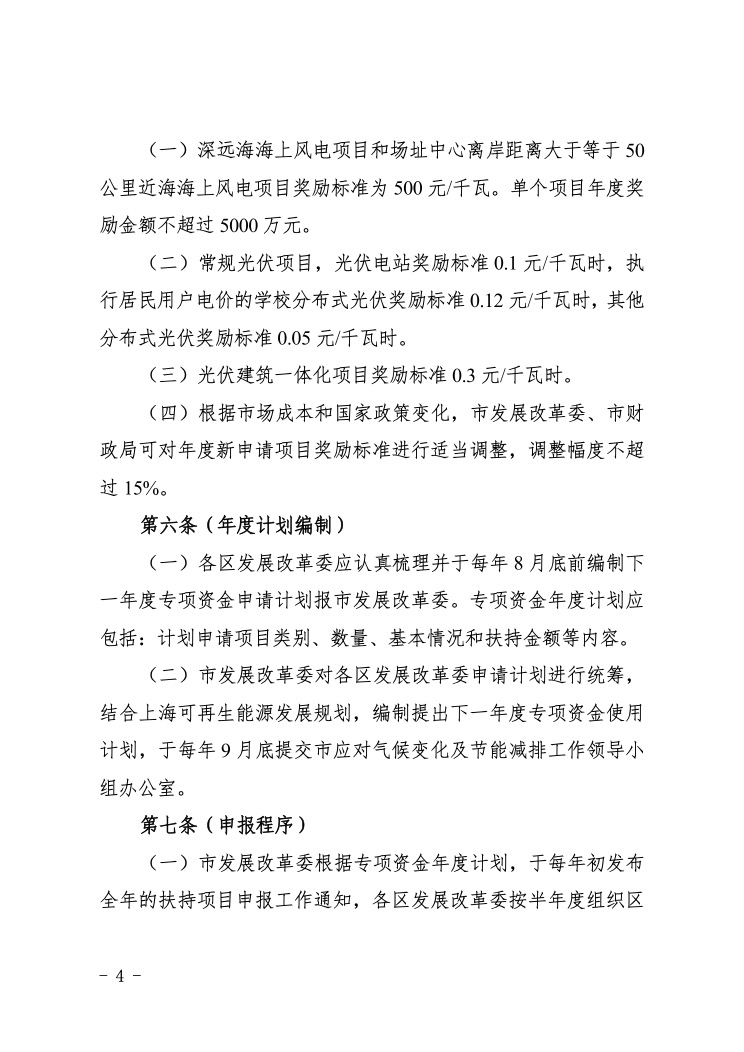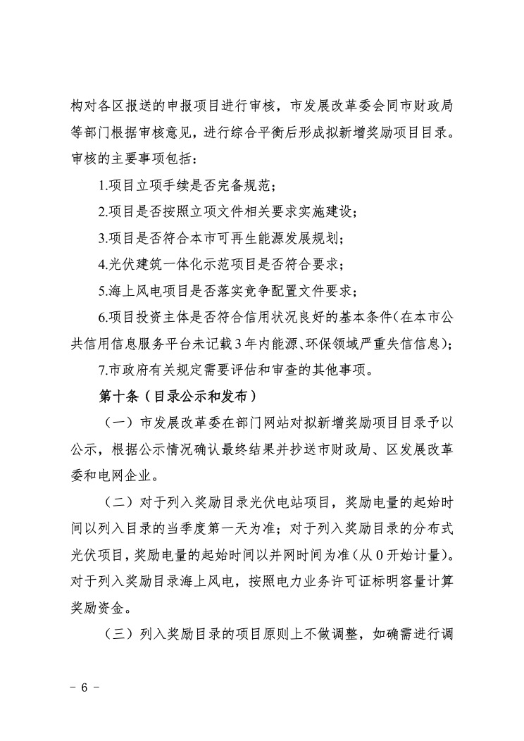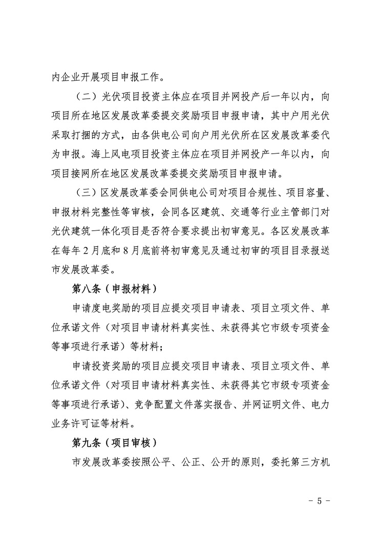 按照《办法》明确的支持范围、支持方式和奖励标准、申报程序等要求,各区发展改革委按半年度组织电网企业、投资主体做好项目初审和转报工作,于2024年2月底、8月底前将截至申报日的可再生能源项目进行线上初审,并将初审意见和目录清单报送上海市发改委。上海市发改委第三方机构对各区初审通过项目进行审核,按程序发布奖励项目目录。