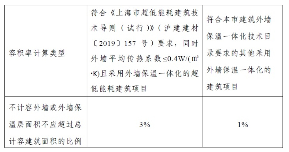 (二)容积率计算。超低能耗建筑项目符合本市相关技术要求并经审核通过的,其外墙面积可不计入容积率,但其建筑面积最高不应超过总计容建筑面积的3%;采用外墙保温一体化(仅采用内保温一体化的除外)的建筑项目符合本市相关技术要求并经审核通过的,其外墙保温层面积可不计入容积率, 但其建筑面积最高不应超过总计容建筑面积的1%。