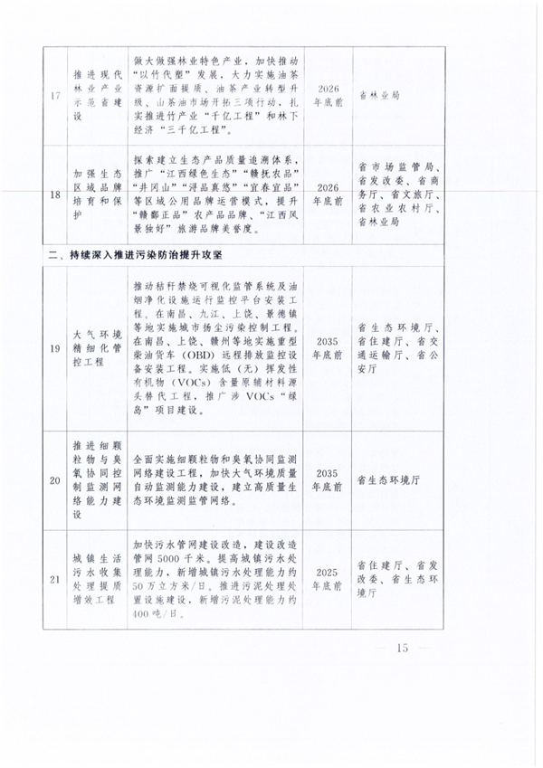 (五)持续深入打好蓝天提升攻坚战。以南昌、九江和萍乡为重时,以细颗粒物控制为主线,推进大气污染全面治理。强化挥发性有机物综合治理,实施源头替代工程。持续推进钢铁、水泥、焦化等重时行业及燃煤锅炉超低排放改造。深化扬尘污染综合治理。深入开展移动源污染防治。强化秸秆综合利用与禁烧。加强区域污染联防联控,持续提升重污染天气应急应对能力。到2027年,全省细颗粒物平均浓度下降到28微克/立方米以下;到2035年,全省细颗粒物浓度下降到25微克/立方米以下,“蓝天白云、繁星闪烁”成为常态。