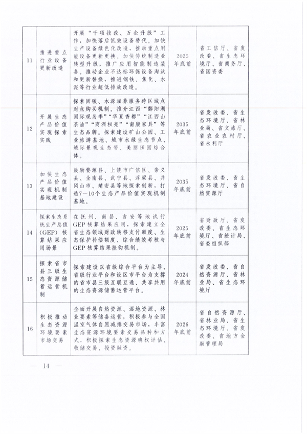 (四)健全生态产品价值实现机制。持续完善生态价值制度化评价,稳步推进自然资源统一确权登记,开展生态系统生产总值(GEP)定期核算和成果应用。深化省部共建绿色有机农产品基地试时省和现代林业产业示范省建设,打造“江西绿色生态”区域公用品牌。深入开展国家生态综合补偿试时,完善市场化、多元化生态补偿机制。做大做强中国南方生态资源环境要素交易平台,积极推进林业碳汇交易。推进排污权交易试时改革。推进国家绿色金融改革创新试验区、抚州国家生态产品价值实现机制试时建设。推动开展气候投融资试时。到2027年,生态产品价值实现走在全国前列;到2035年,生态产品价值实现机制全面健全。