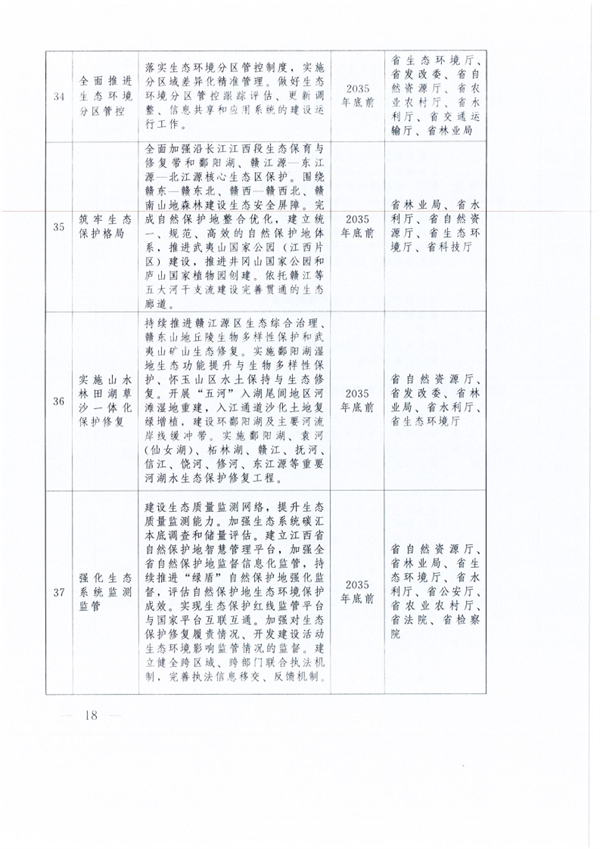 (十)持续筑牢自然生态屏障。夯实“一江双心、五河三屏”生态保护格局,推进国家重点生态功能区、重要生态廊道保护建设。健全以国家公园为主体的自然保护地体系,完成自然保护地整合优化,推进武夷山国家公园(江西片区)建设,推进井冈山国家公园和庐山国家植物园创建。健全生态监测网络,加强生态状况监测评估。持续推进“绿盾”自然保护地强化监督,建立生态保护红线生态破坏问题监督机制。到2035年,生态系统格局更加稳定,展现赣鄱大地秀美山川勃勃生机。