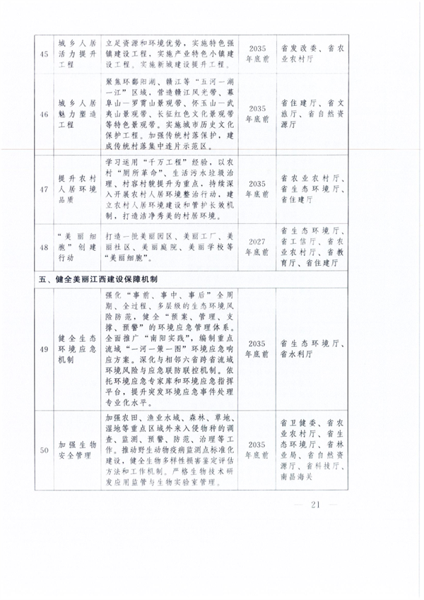 (十三)建设美丽江西先行区。全面融入长江经济带发展战略和美丽中部建设,共建人与自然和谐共生的绿色发展示范带。协同推进生态环境保护和绿色低碳发展。完善南昌都市圈生态环境协调保护机制,打造绿色低碳发展高地,展现“浩渺鄱湖、沃野千里”大美风光。深化赣州、吉安与粤港澳大湾区生态环境保护长效合作机制,推进革命老区美丽建设,展现“郁郁葱葱、碧水长流”俊美风景。推动赣东北地区绿色低碳发展领域开放合作,加速对接融入美丽长三角一体化,展现“妩媚青山、小桥流水”秀美风韵。促进赣西地区产业绿色转型和新兴绿色动能培育,展现“山明水秀、阡陌纵横”和美风貌。打造赣中地区生态产品价值实现和生态经济发展标杆,展现“红绿辉映、山水交融”娇美风姿。各设区市结合自身特色和优势,谱写美丽江西建设市域篇章。深入推进生态文明示范建设,推动“绿水青山就是金山银山”实践创新基地建设。到2027年,累计创建国家生态文明建设示范区40个、“绿水青山就是金山银山”实践创新基地14个。