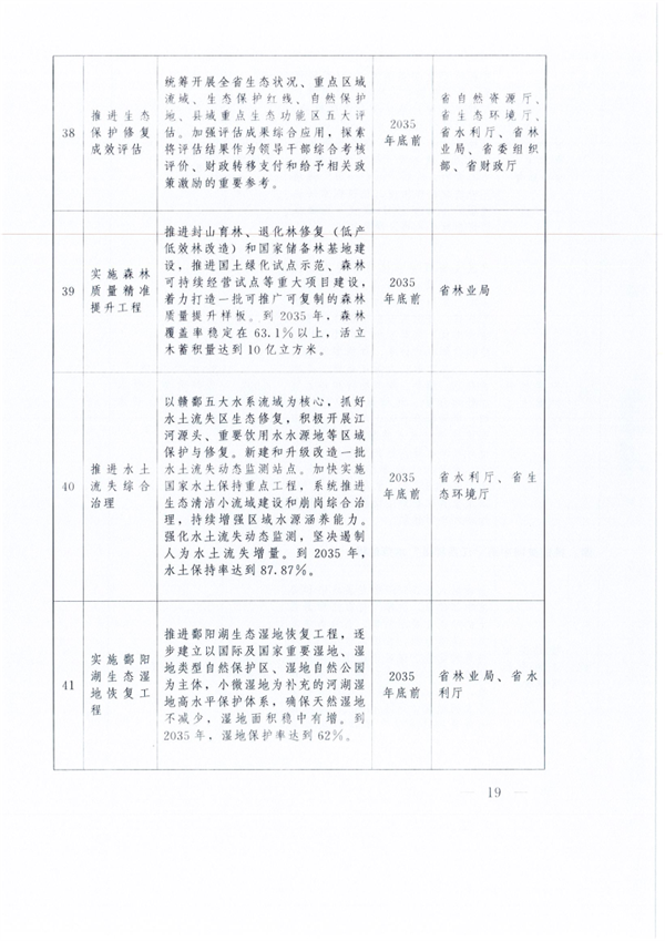 (十一)推进生态系统保护修复。构建“一带两核六区”生态修复格局,实施重要生态系统保护和修复重大工程。开展山水林田湖草沙一体化保护和修复。加快推进鄱阳湖水利枢纽工程建设。实施鄱阳湖生态湿地恢复工程,强化鄱阳湖全流域生态环境综合治理。深入推进森林可持续经营试点重点省建设。系统推进生态清洁小流域建设和崩岗综合治理。大力推进历史遗留废弃矿山生态修复。到2035年,森林覆盖率稳定在63.1%以上,活立木蓄积量达到10亿立方米,湿地保护率达到62%,水土保持率达到87.87%,生态系统基本实现良性循环。