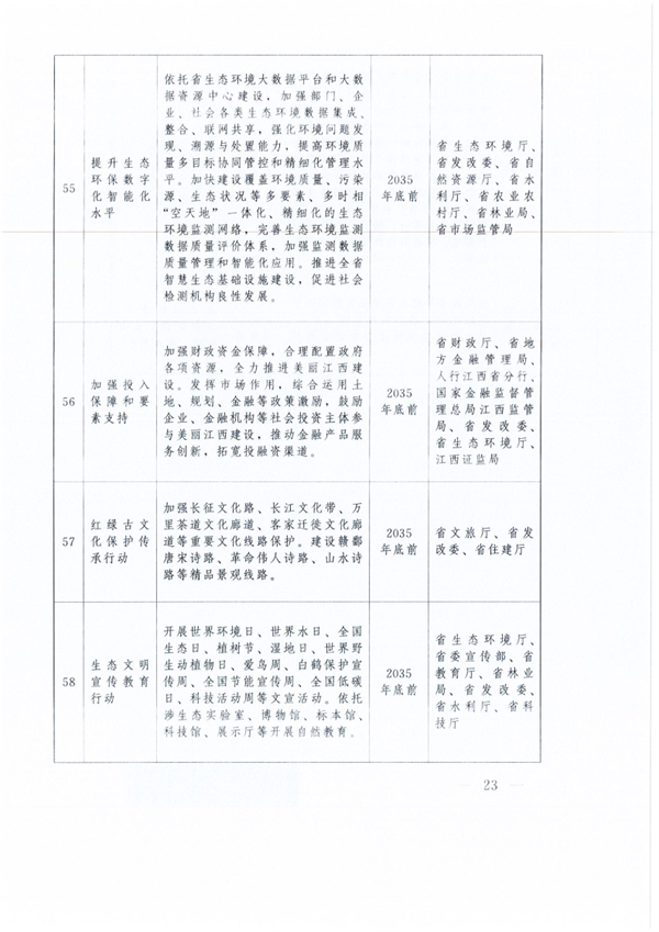 (十八)完善体制机制。加强科技支撑,创新生态环境科技体制机制,加强企业主导的产学研深度融合,支持高校和科研单位加强环境学科建设。加强环境污染防治江西省重点实验室和大气污染防治攻关联合中心等平台、美丽江西建设研究院等智库建设,加大生态环境领域的基础研究、应用基础研究及核心技术攻关。强化对美丽江西建设的财政、金融、价格等政策支持。深化省以下生态环境机构监测监察执法垂直管理制度改革。持续提升生态环境监管能力,加强生态环境人才队伍建设。加快数字赋能,构建美丽江西数字化治理体系。强化美丽江西建设法治保障,健全地方法规政策,充分发挥国家技术标准创新基地(江西绿色生态)作用,加快推进美丽江西建设重点领域标准规范研制工作。