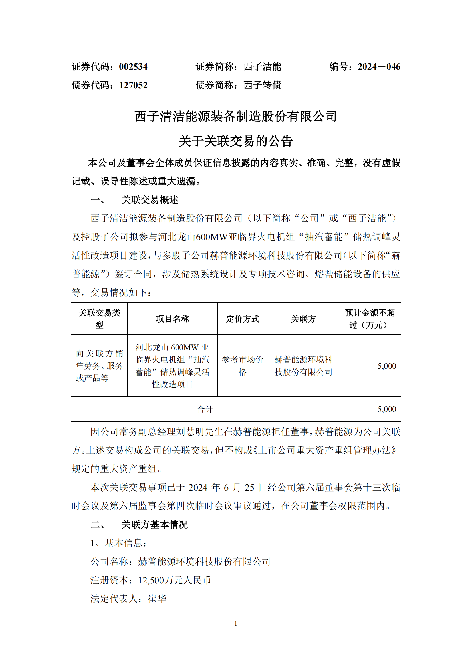 北极星储能网获悉,西子洁能6月25日晚间公告称,西子清洁能源装备制造股份有限公司(以下简称“西子洁能”)及控股子公司拟参与河北龙山600MW亚临界火电机组“抽汽蓄能”储热调峰灵活性改造项目建设,与参股子公司赫普能源环境科技股份有限公司(以下简称“赫普能源”)签订合同,涉及储热系统设计及专项技术咨询、熔盐储能设备的供应等。签约合同合计不超过人民币 5,000 万元。