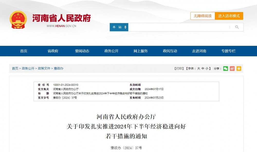 7月23日,河南省人民政府发布的《关于印发扎实推进2024年下半年经济稳进向好若干措施的通知》。