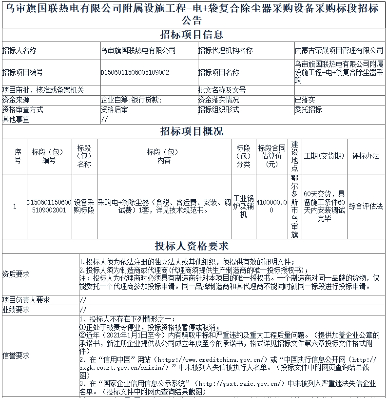 日前,乌审旗国联热电有限公司附属设施工程-电+袋复合除尘器采购设备采购标段招标公告发布。公告显示,项目采购电+袋除尘器(含税、含运费、安装、调试费)1套,项目估算价410万。公告如下: