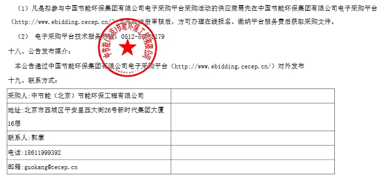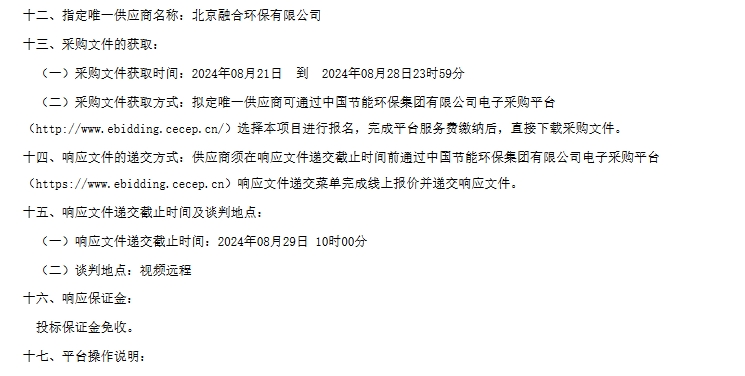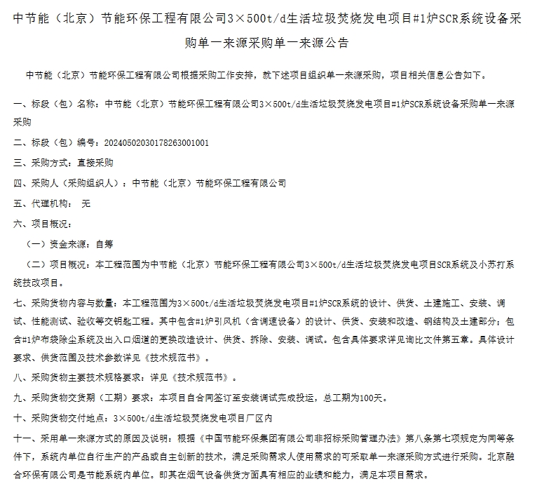 8月21日,中节能(北京)节能环保工程有限公司3×500t/d生活垃圾焚烧发电项目#1炉SCR系统设备采购单一来源采购采购公告。