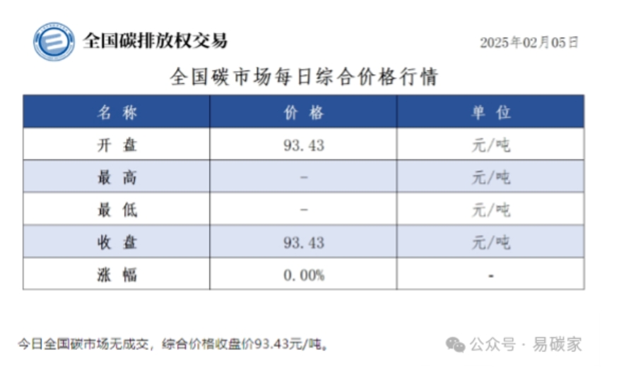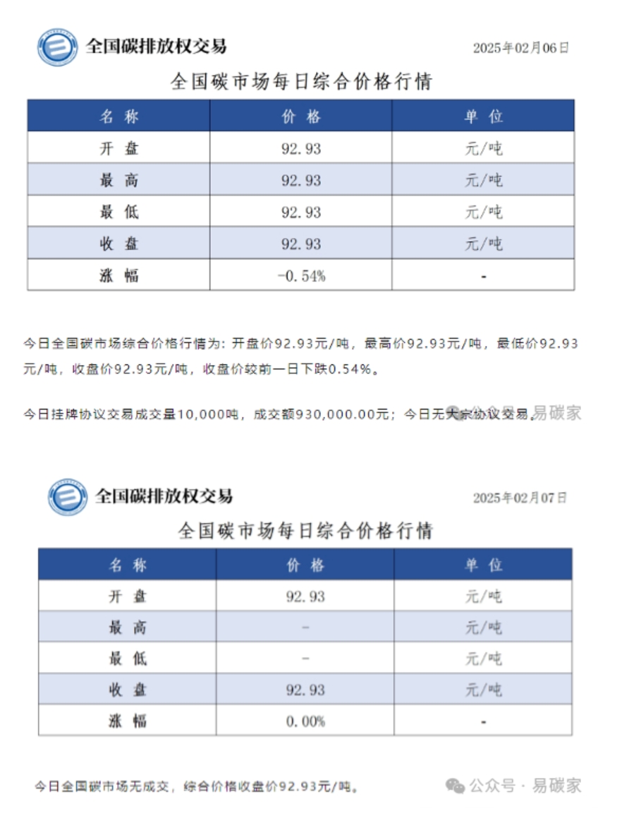 春节假期过后,全国碳排放权交易市场出现明显降温。节后首周(2月5日至2月7日),全国碳市场仅1天实现交易,碳排放配额成交量仅为1万吨,成交额93万元,较1月平均水平大幅下降。同时,1月碳配额日均成交量为11.72万吨,较去年12月的342.57万吨有较大幅度缩水;日均收盘价94.78元/吨,较去年12月下跌4.6%。