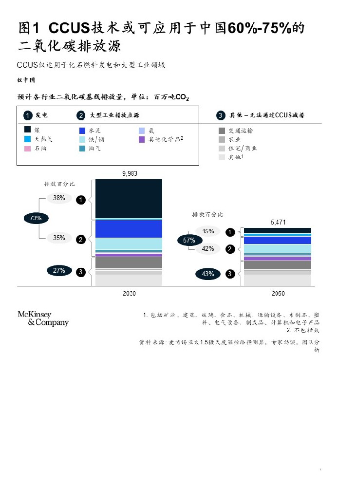 CCUS是中国实现1.5摄氏度温控目标的关键技术抓手,可广泛应用于各行各业,特别是占中国二氧化碳排放量的60%-75%的电力行业及减排较难的工业部门,CCUS更是不可或缺的技术手段(见图1)。综合考量麦肯锡1.5摄氏度情景分析的排放总额,以及其他抓手潜在的最大排放量,我们发现这些难减行业减排目标的35%-40%需要依靠CCUS等尚不成熟的技术加以解决。如果其他减排抓手的应用速度与规模不理想,就更需要CCUS来填补碳中和缺口。到2050年,CCUS年减排量要达到约14亿吨二氧化碳,而当前产能仅100万吨,应加快探索大规模应用手段。