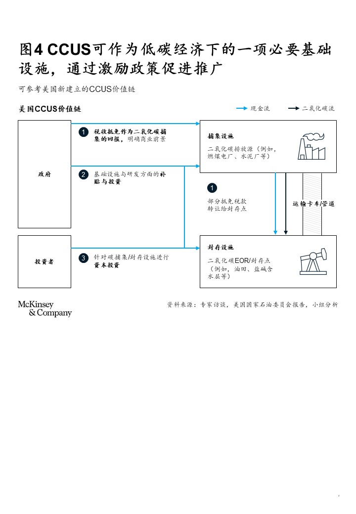 我们认为,未来CCUS可能成为碳中和转型下的一项必不可少的技术选项,需要政策激励,与企业产生合力、加速推广。我们分析了美国如何建立推广CCUS价值链的应用案例,希望可以为中国业界提供有效参考(见图4)。