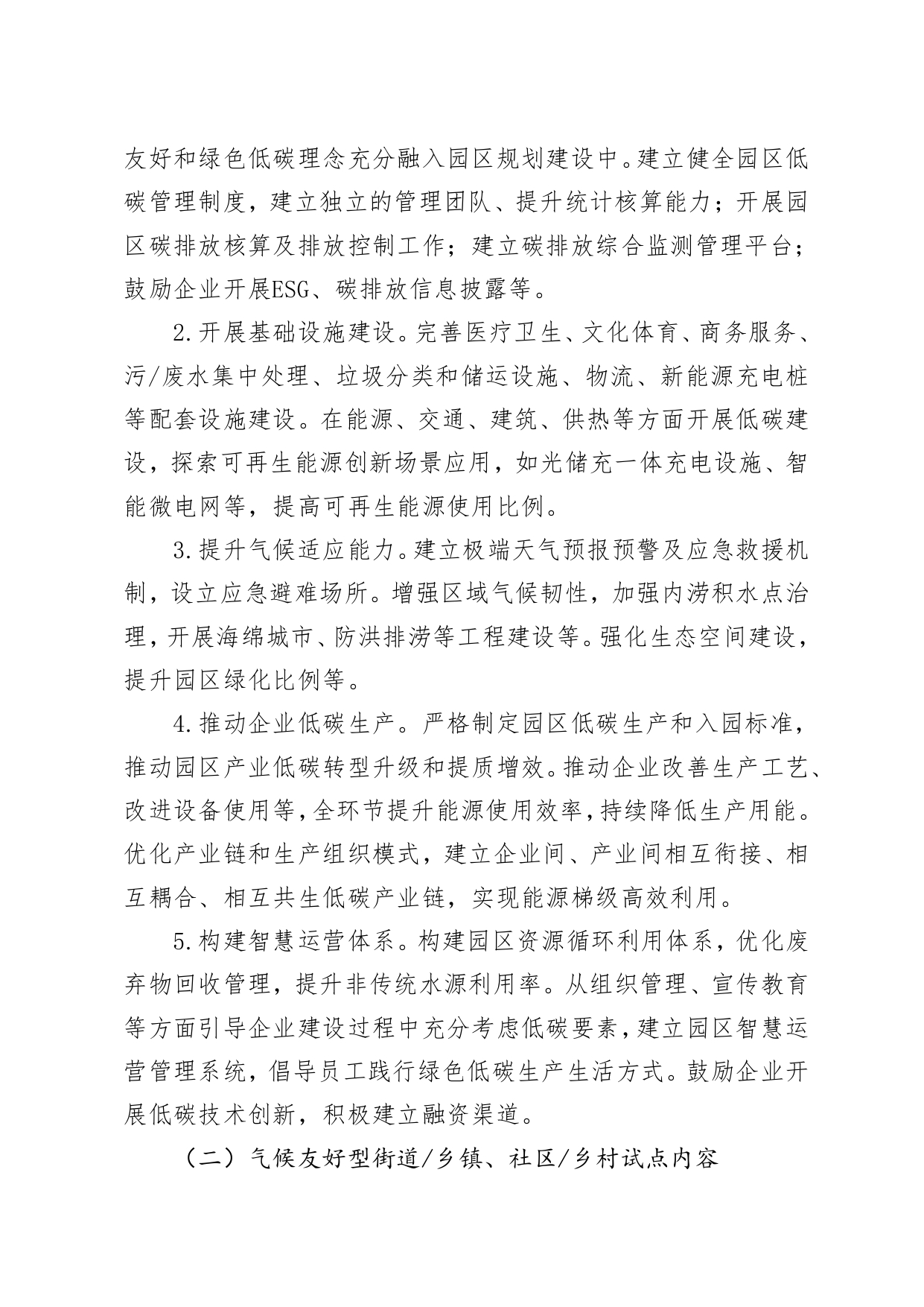 针对园区、街道/乡镇、社区/村等小尺度区域,选取一批在减缓和适应气候变化规划设计、项目建设、运行管理、宣传推广等方面基础较好的区域,通过落实先进理念、先进技术和管理模式、减少温室气体排放等气候友好行动,创建一批具有特色、可复制、可推广的小尺度气候友好型区域发展模式。其中2024年优先征集评选气候友好型园区。