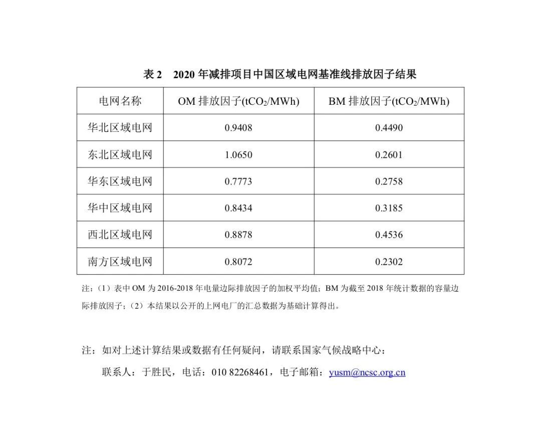 2020年度减排项目中国区域电网基准线排放因子