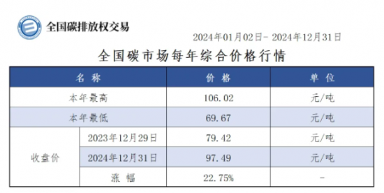 2024年1月2日-2024年12月31日全国碳市场综合价格行情为:最高价106.02元/吨,最低价69.67元/吨,收盘价较去年最后一个交易日上涨22.75%。