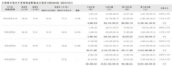 2024年1月2日-2024年12月31日挂牌协议交易成交量37,027,420吨,成交额3,631,089,165.61元;大宗协议交易成交量151,618,633吨,成交额14,482,487,418.62元。