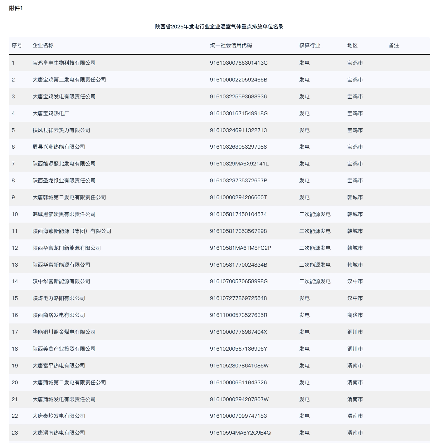 按照国务院《碳排放权交易管理暂行条例》(国务院775号令)和生态环境部办公厅《关于做好2023—2025年发电行业企业温室气体排放报告管理有关工作的通知》(环办气候函〔2023〕43号)、《关于做好2023—2025年部分重点行业企业温室气体排放报告与核查工作的通知》(环办气候函〔2023〕332号)有关规定,按照市级筛选上报、省厅审核核定的程序,省厅确定了《陕西省2025年度发电行业企业温室气体重点排放单位名录》和《陕西省2024年度其他行业温室气体重点排放单位名录》,现印发你们,请督促相关重点排放单位按照国家规定时限和要求报送温室气体排放数据。