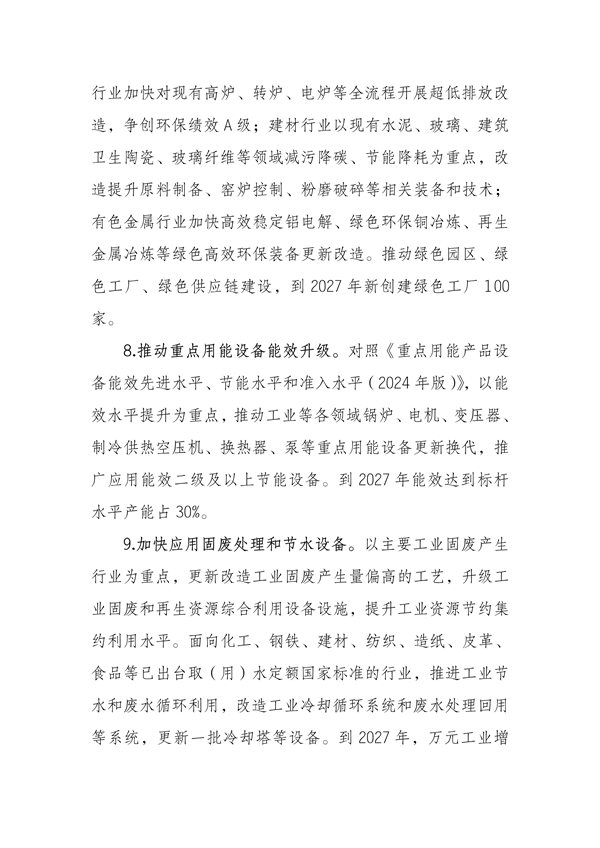 加快应用固废处理和节水设备。以主要工业固废产生行业为重点,更新改造工业固废产生量偏高的工艺,升级工业固废和再生资源综合利用设备设施,提升工业资源节约集约利用水平。