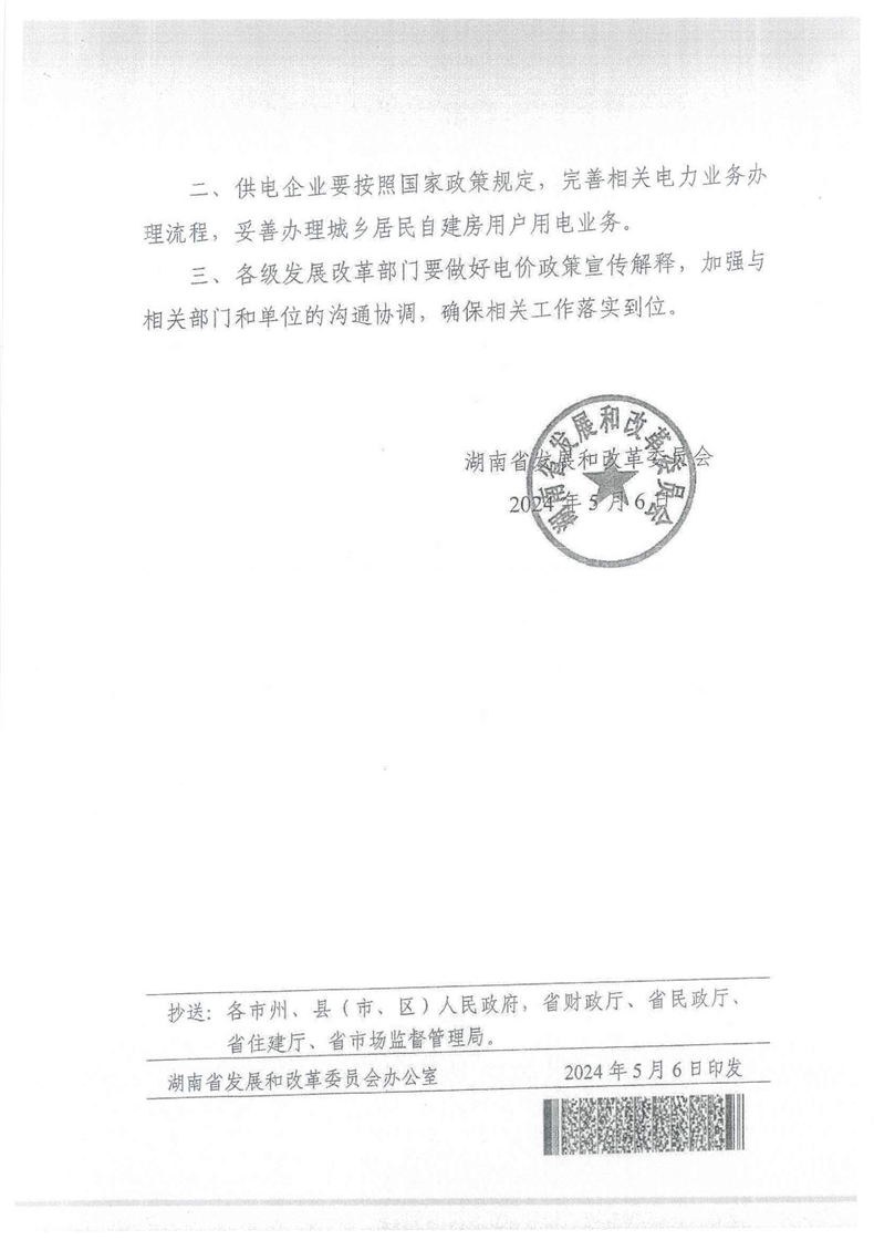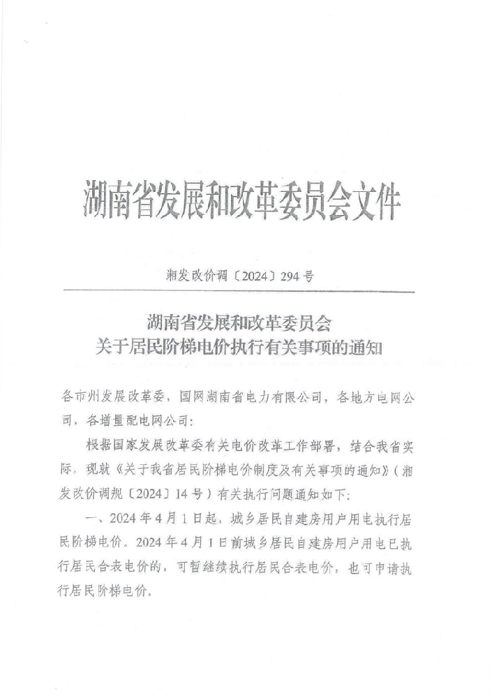 湖南省发展和改革委员会发布关于居民阶梯电价执行有关事项的通知,2024年4月1日起,城乡居民自建房用户用电执行居民阶梯电价。2024年4月1日前城乡居民自建房用户用电已执行居民合表电价的,可暂继续执行居民合表电价,也可申请执行居民 阶梯电价。