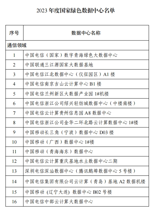 按照《工业和信息化部办公厅 国家发展改革委办公厅 商务部办公厅 国管局办公室 金融监管总局办公厅 国家能源局综合司关于组织开展2023年度国家绿色数据中心推荐工作的通知》(工信厅联节函﹝2023﹞341号)要求,经地方推荐、专家评审、社会公示等程序,现将2023年度50家国家绿色数据中心名单予以公告。