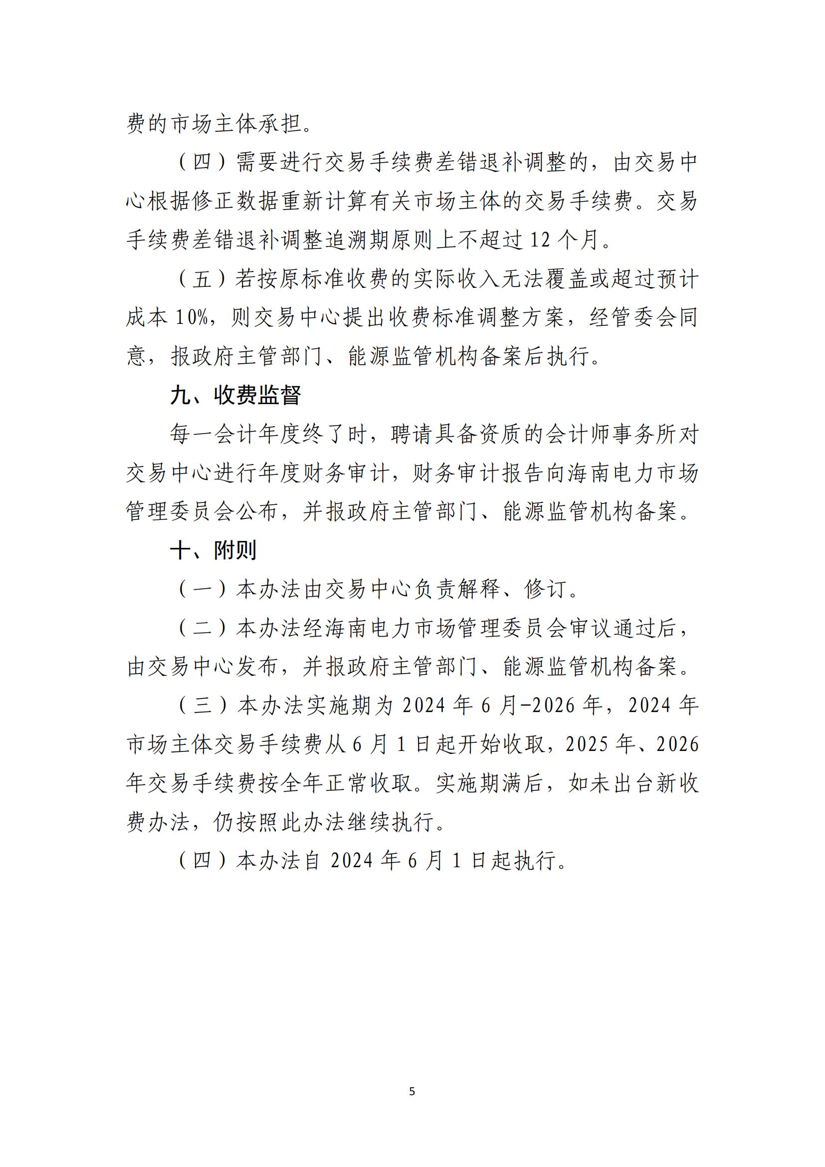 摘要:海南电力交易中心发布了《海南电力市场交易服务费收费管理办法》,明确了中长期和现货交易的收费标准和范围。中长期交易包括多种周期和方式,部分集中交易不收取手续费;现货交易仅对日前交易收费。收费标准统一为0.54厘/千瓦时。该管理办法基于电力体制改革文件制定,经审议和备案后印发,要求各市场主体遵照执行,以促进电力市场规范化发展。