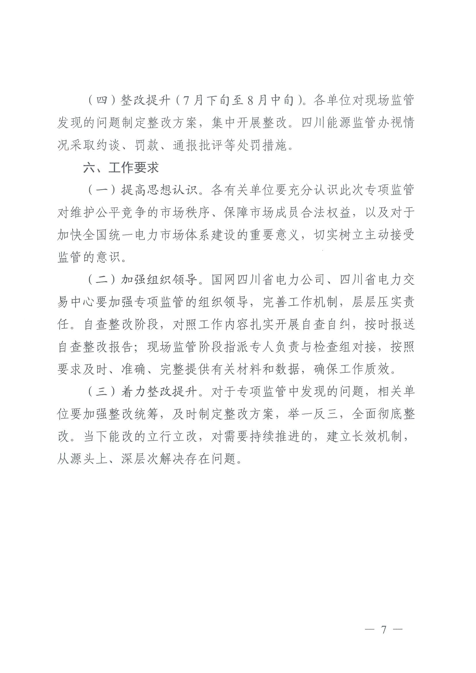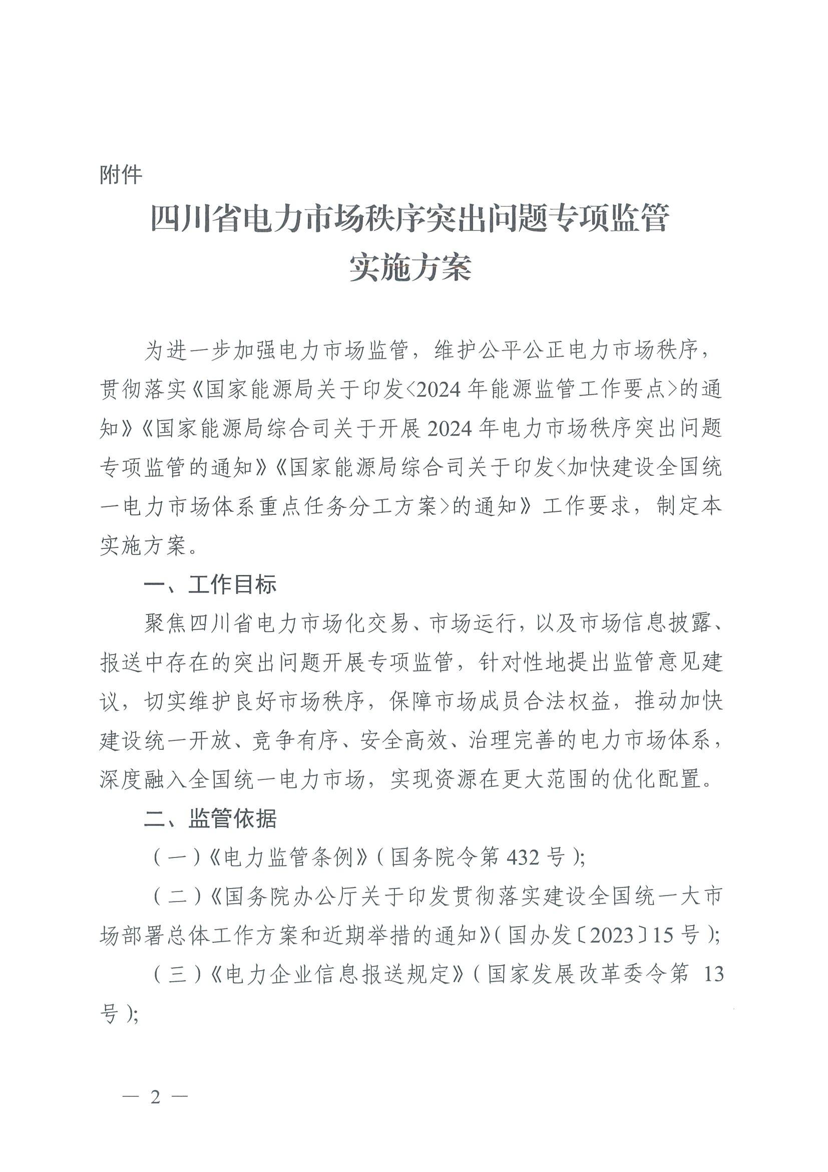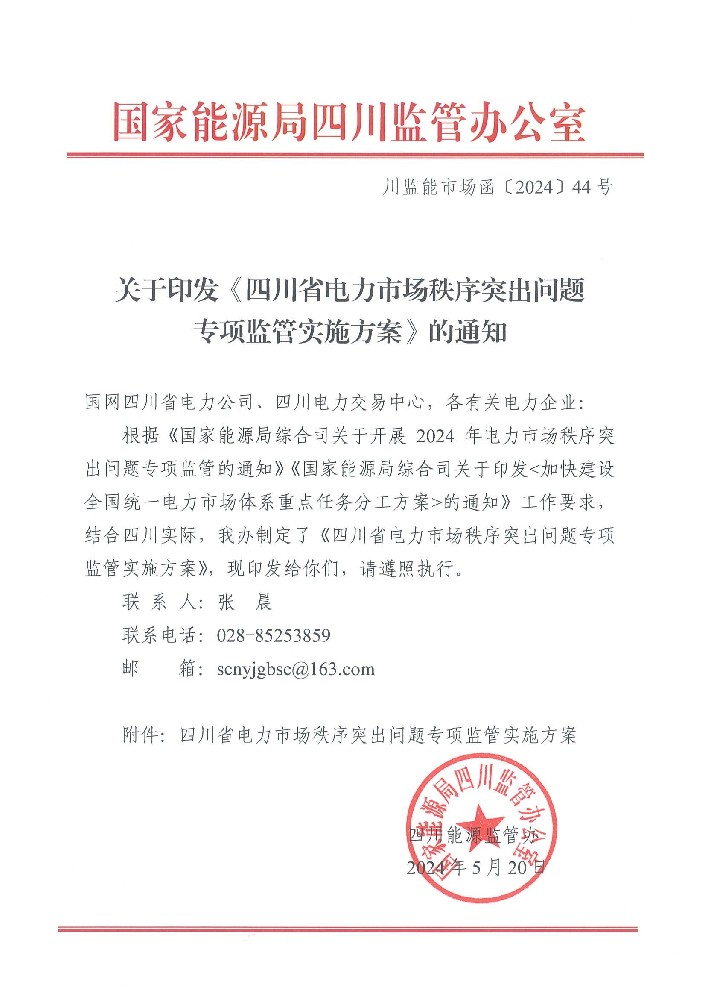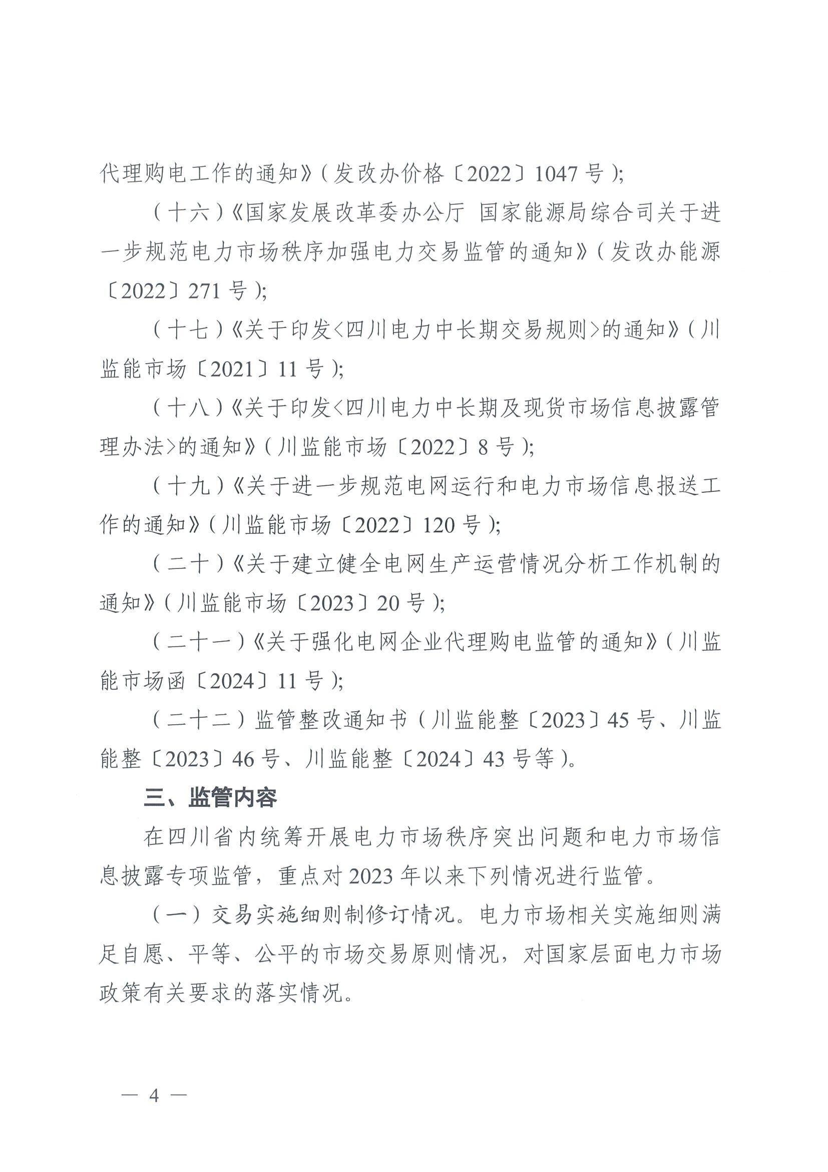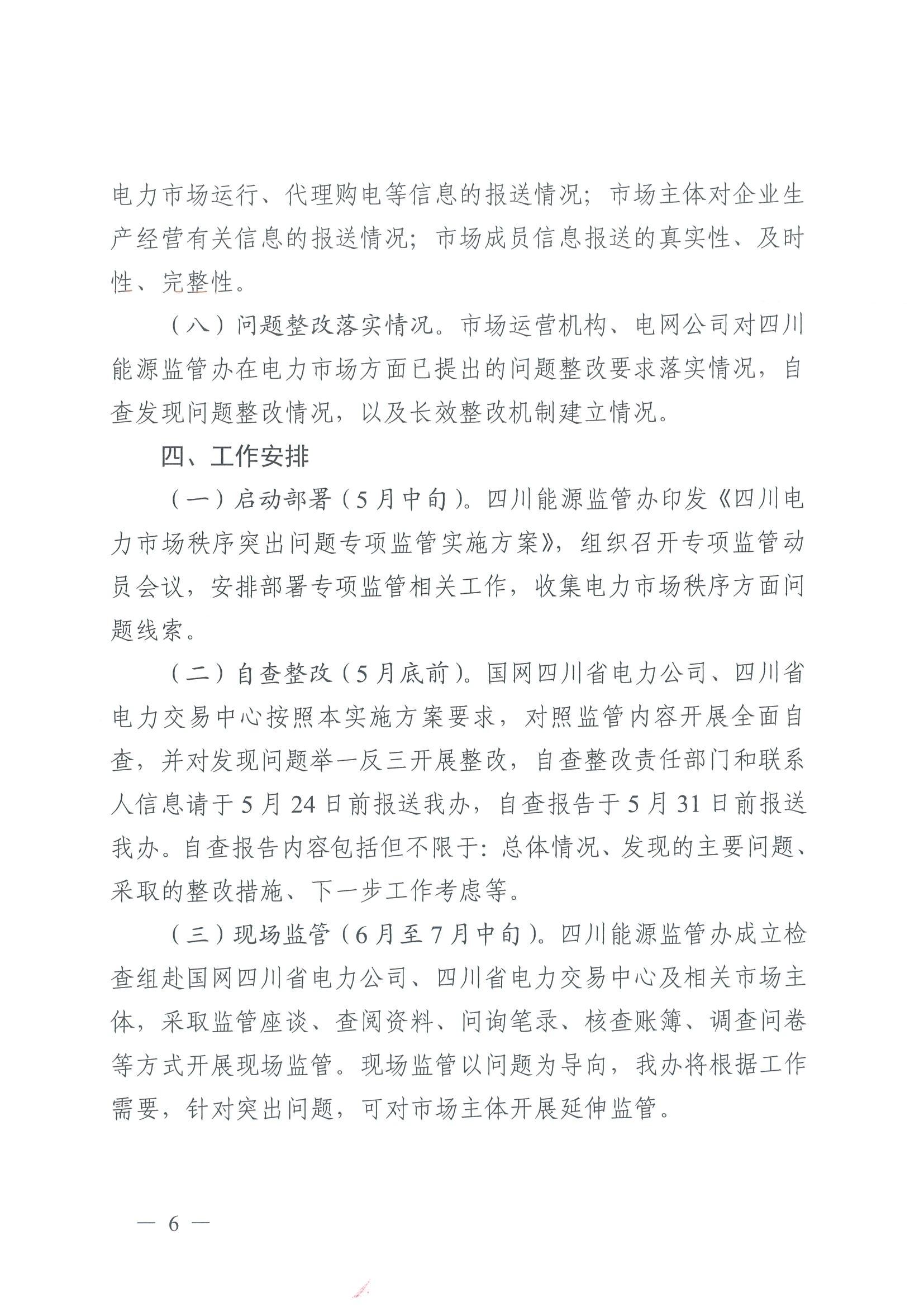 四川能监办日前印发《四川省电力市场秩序突出问题专项监管实施方案》的通知,在四川省内统筹开展电力市场秩序突出问题和电力市场信息披露专项监管,重点对2023年以来下列情况进行监管,包括交易实施细则制修订情况、市场交易组织开展情况、市场主体参与交易情况、电力市场费用结算情况、电力市场信息披露情况、市场运行监测及风险防控情况、电力监管信息报送情况以及问题整改落实情况等。