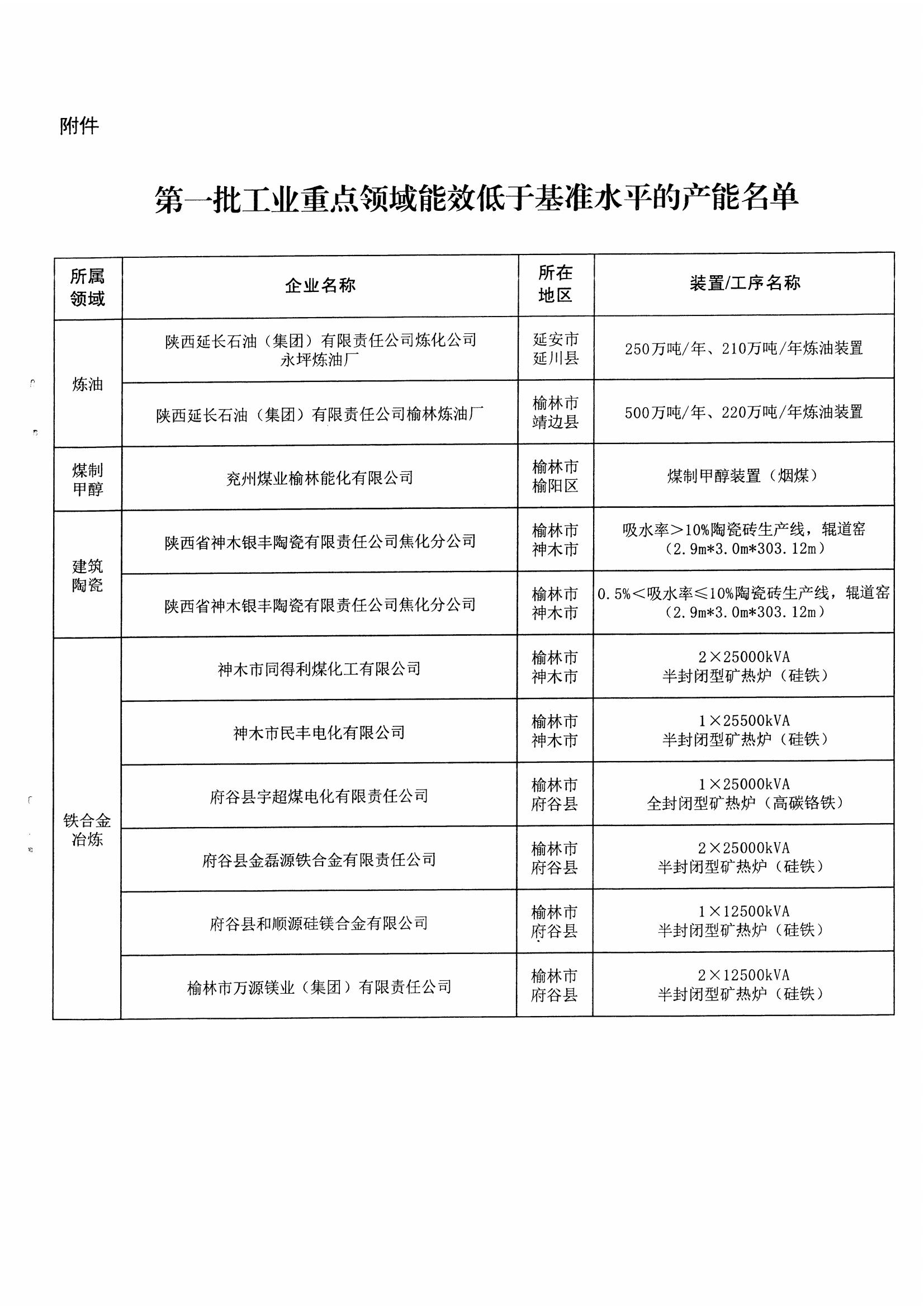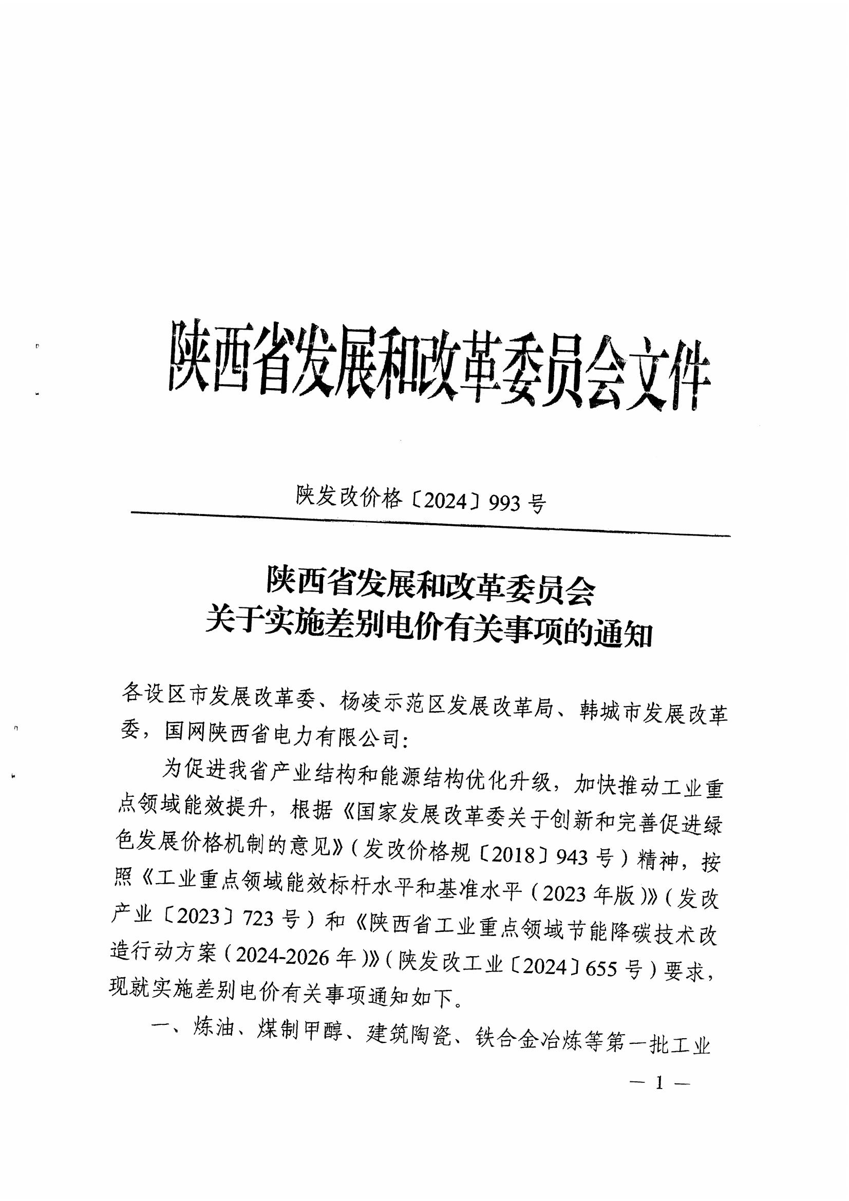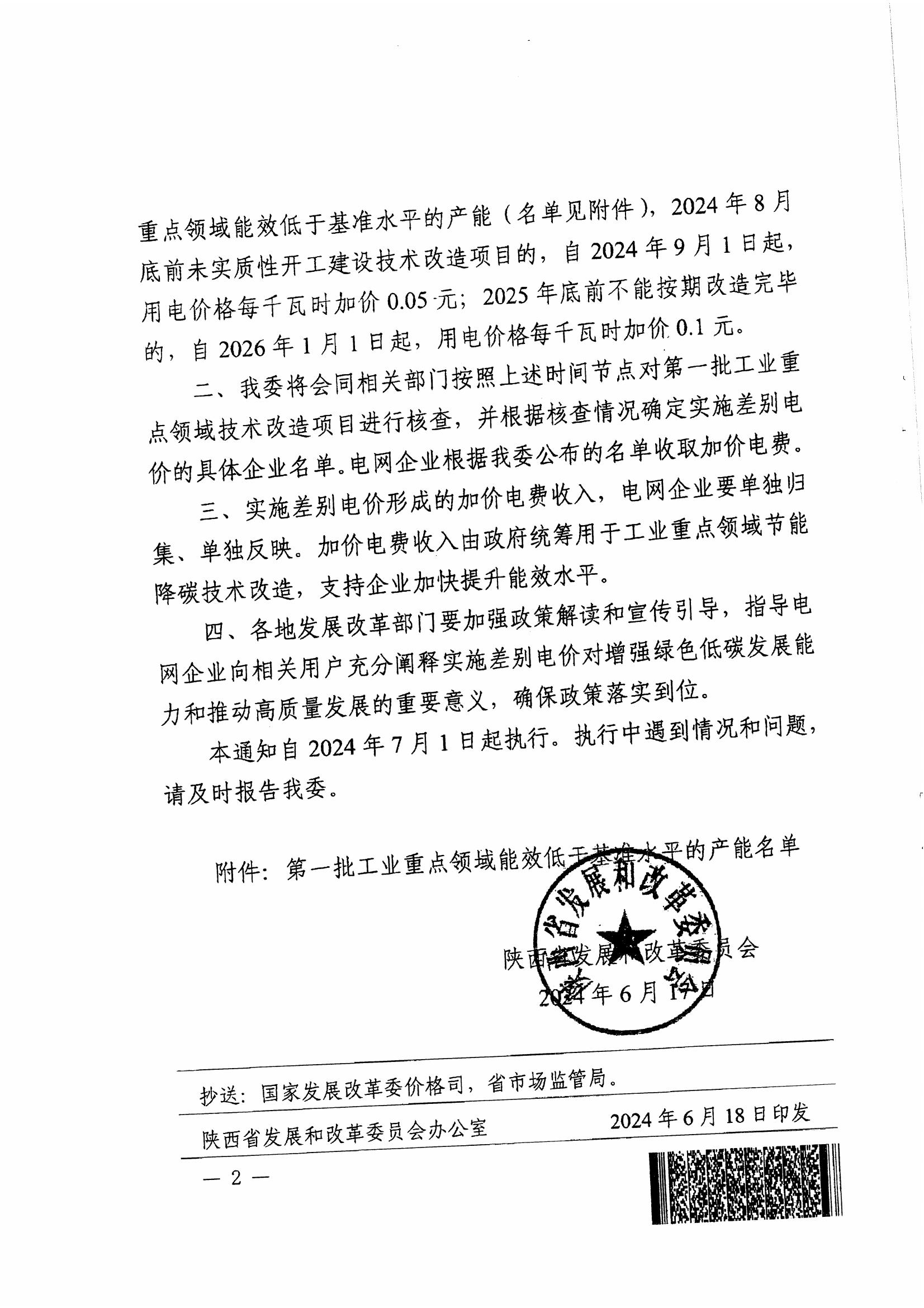 7月12日,陕西省汉中市洋县发展和改革局转发《市发改委转发<省发改委关于实施差别电价有关事项的通知>的通知》的通知,其中提到,炼油、煤制甲醇、建筑陶瓷、铁合金冶炼等第一批工业重点领域能效低于基准水平的产能(名单见附件),2024年8月底前未实质性开工建设技术改造项目的,自2024年9月1日起,用电价格每千瓦时加价0.05元;2025年底前不能按期改造完毕的,2026年1月1日起,用电价格每千瓦时加价0.1元。