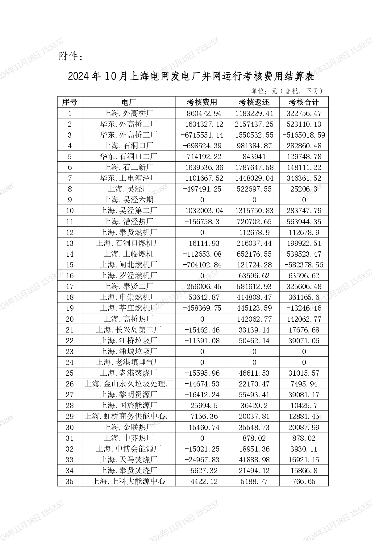 附件:2024年10月上海电网发电厂并网运行考核费用结算表