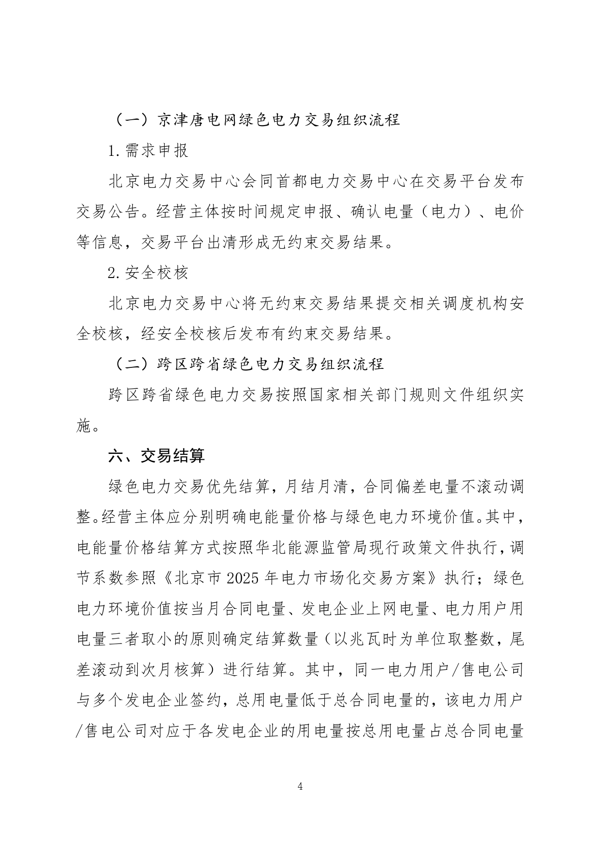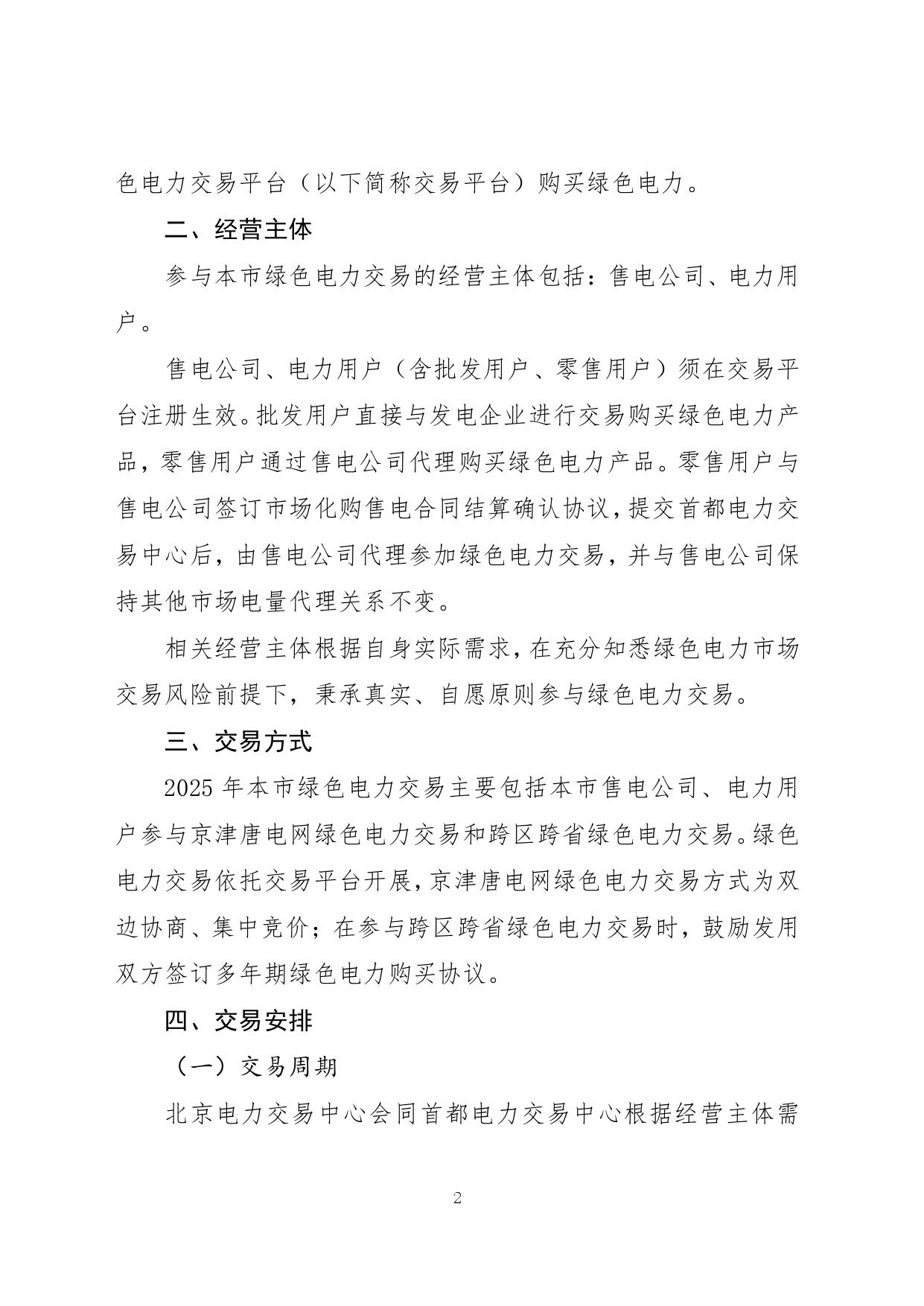 2025年本市绿色电力交易主要包括本市售电公司、电力用户参与京津唐电网绿色电力交易和跨区跨省绿色电力交易。绿色电力交易依托交易平台开展,京津唐电网绿色电力交易方式为双边协商、集中竞价;在参与跨区跨省绿色电力交易时,鼓励发用双方签订多年期绿色电力购买协议。