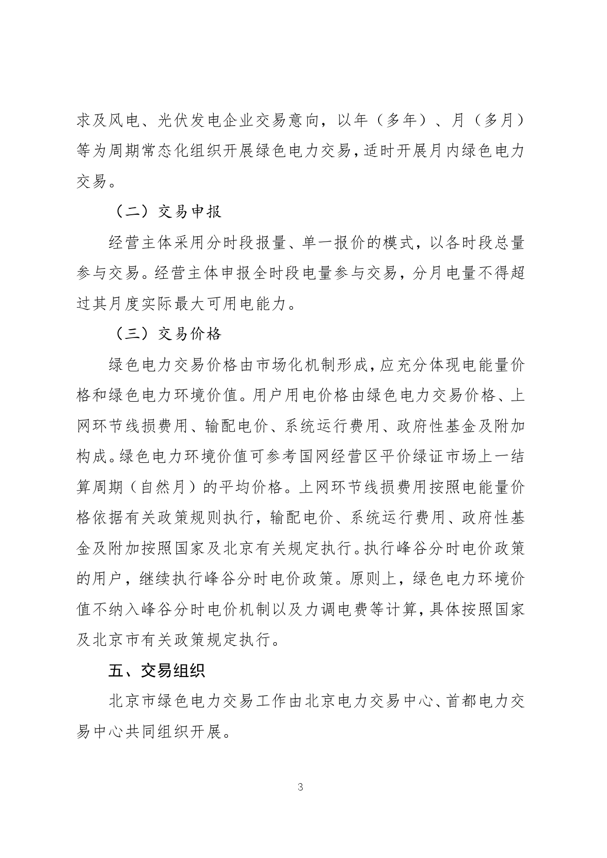 绿色电力交易价格由市场化机制形成,应充分体现电能量价格和绿色电力环境价值。用户用电价格由绿色电力交易价格、上网环节线损费用、输配电价、系统运行费用、政府性基金及附加构成。绿色电力环境价值可参考国网经营区平价绿证市场上一结算周期(自然月)的平均价格。上网环节线损费用按照电能量价格依据有关政策规则执行,输配电价、系统运行费用、政府性基金及附加按照国家及北京有关规定执行。执行峰谷分时电价政策的用户,继续执行峰谷分时电价政策。原则上,绿色电力环境价值不纳入峰谷分时电价机制以及力调电费等计算,具体按照国家及北京市有关政策规定执行。