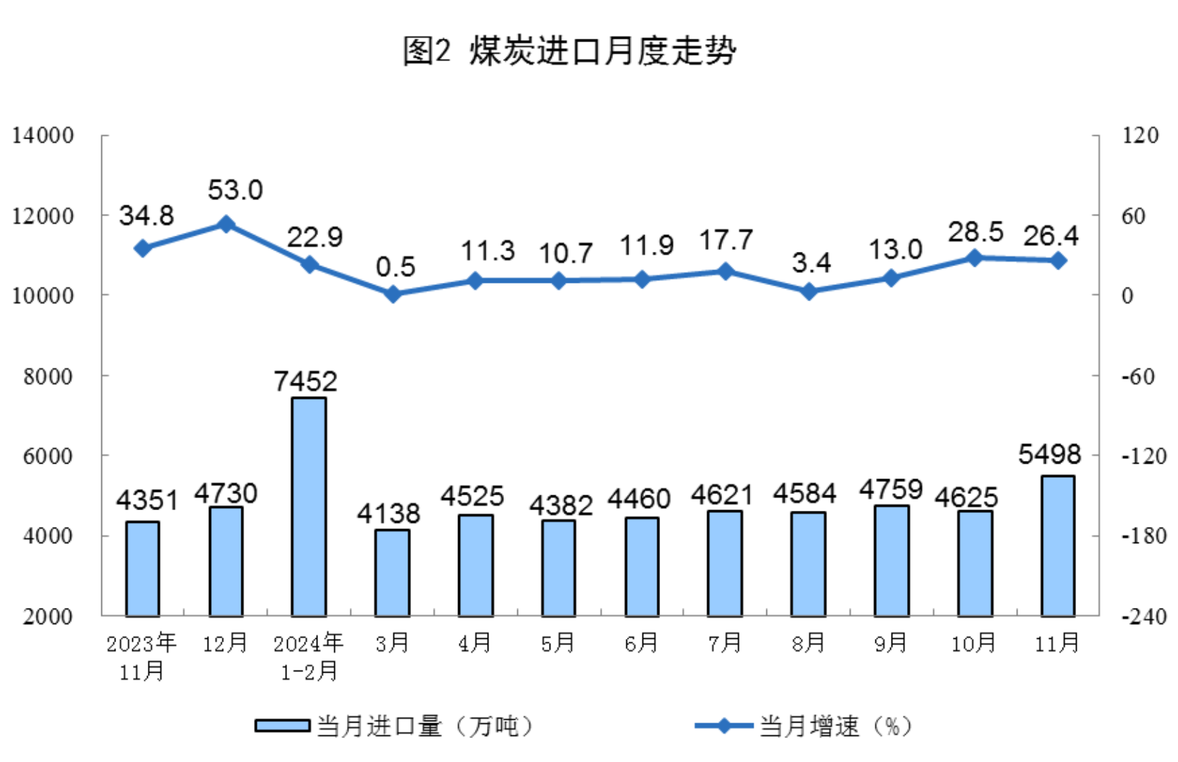 原煤生产稳定增长。11月份,规上工业原煤产量4.3亿吨,同比增长1.8%;日均产量1426.6万吨。进口煤炭5498万吨,同比增长26.4%。