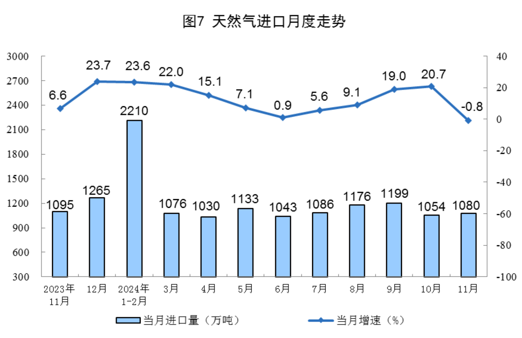 天然气生产稳步增长。11月份,规上工业天然气产量207亿立方米,同比增长3.1%;日均产量6.9亿立方米。进口天然气1080万吨,同比下降0.8%。