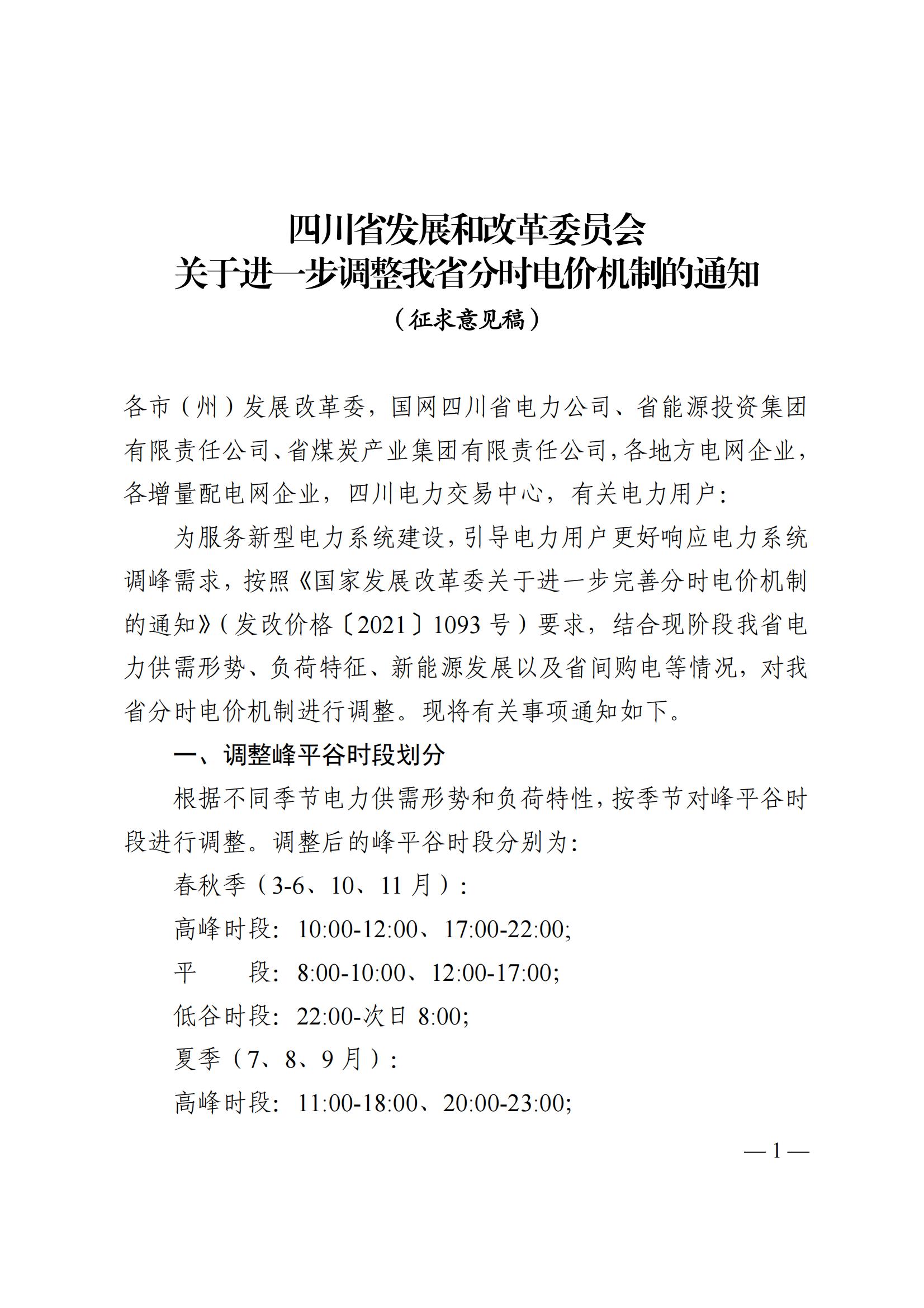 2月7日,四川省发展改革委就《关于进一步调整我省分时电价机制的通知(征求意见稿)》公开征求意见,其中提到,根据不同季节电力供需形势和负荷特性,按季节对峰平谷时段进行调整。