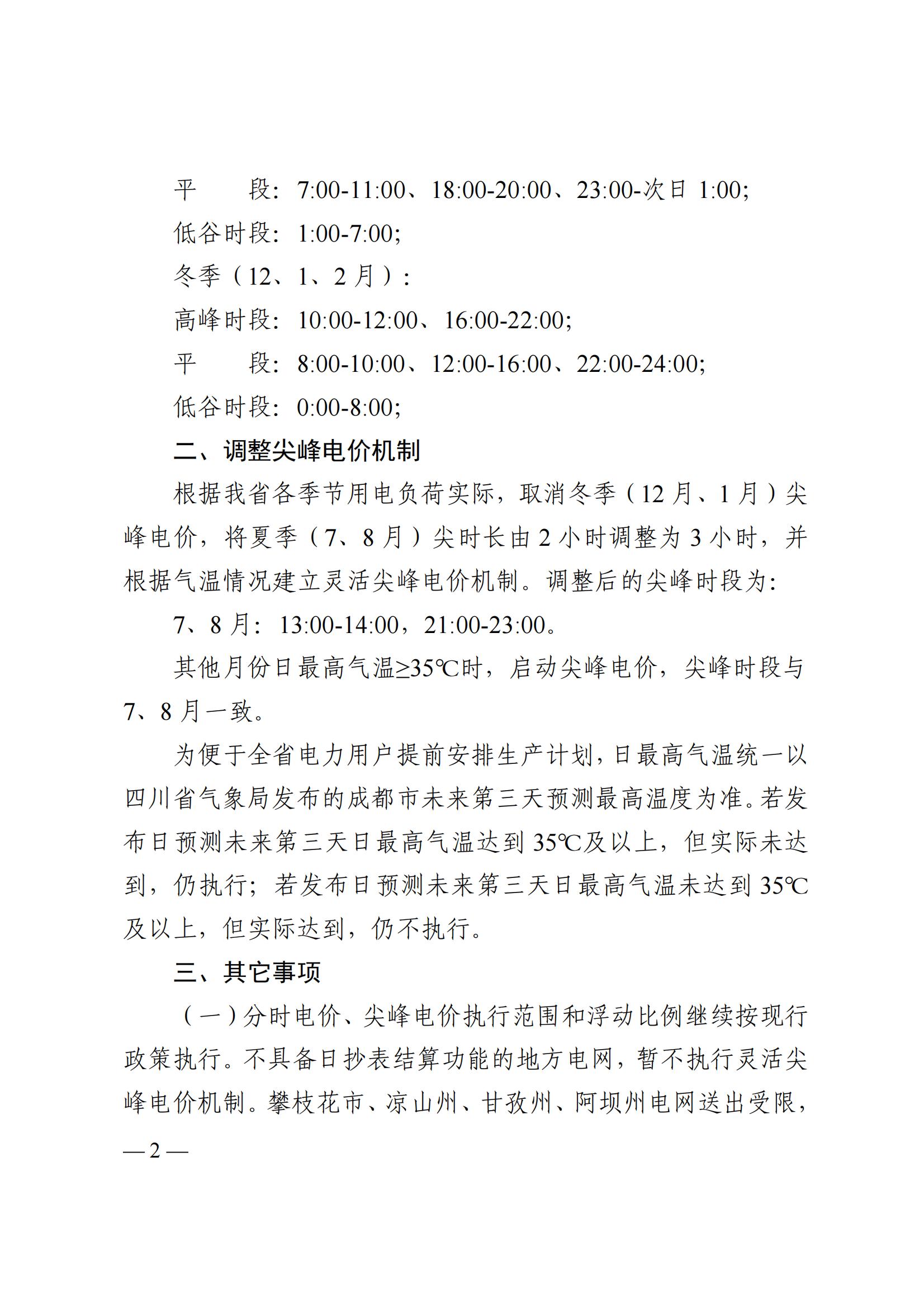根据四川省各季节用电负荷实际,取消冬季(12月、1月)尖峰电价,将夏季(7、8月)尖时长由2小时调整为3小时,并根据气温情况建立灵活尖峰电价机制。