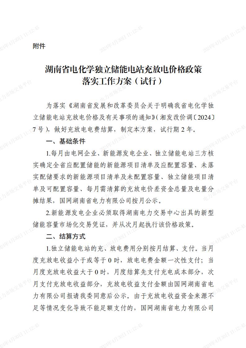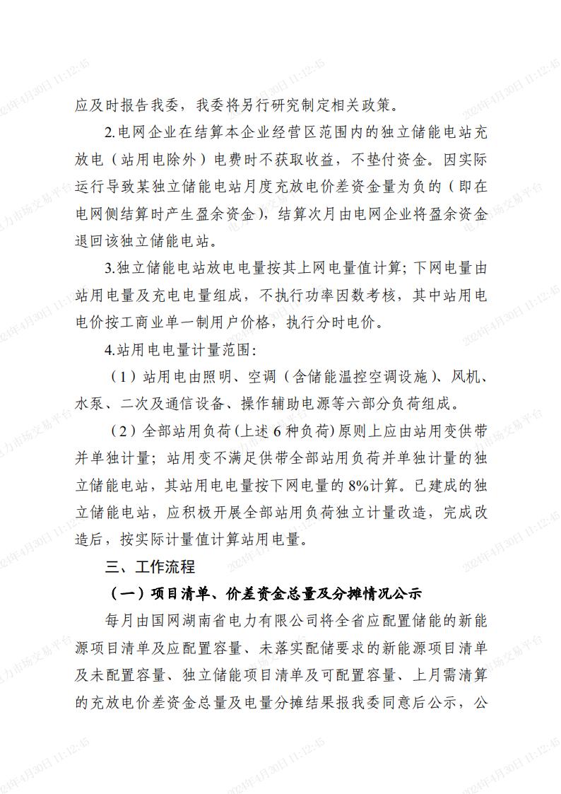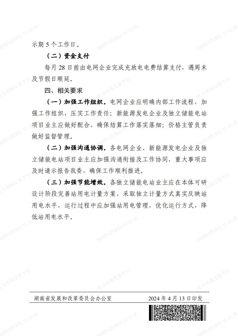 湖南省发展和改革委员会发布关于落实我省电化学独立储能电站充放电价格政策有关工作的通知,其中提到,独立储能电站的充、放电费用分别按月结算、支付。当月度充放电收益小于或等于0时,放电电费金额一次性支付;当月度充放电收益大于0时,月度结算先支付充电成本部分,次月支付充放电收益部分,充放电收益支付金额由国网湖南省电力有限公司报请我委同意后公示。由于充放电收益资金来源不足等情况变化导致不能足额支付的,国网湖南省电力有限公司应及时报告湖南省发改委。