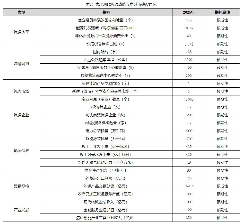 到2025年,大理能源产品现代流通体系加快建设,流通设施智能化建设和节能改造有序推进,绿色电力、油气、煤炭和高原特色农产品流通市场体系基本建立,商品和资源要素流动更加顺畅,商贸和物流服务设施更加完善,面向南亚东南亚和国内主要消费市场的商品流通网络和服务体系更加健全,能源和农产品流通业态模式更加丰富多元,现代流通企业数量和规模进一步培育壮大,交通运输承载能力和金融信用服务支撑能力明显增强,油气、煤炭和粮食等应急保障能力显著提升,绿色电力枢纽建设取得显著成效,清洁载能产业全面实现全链条集群化发展。